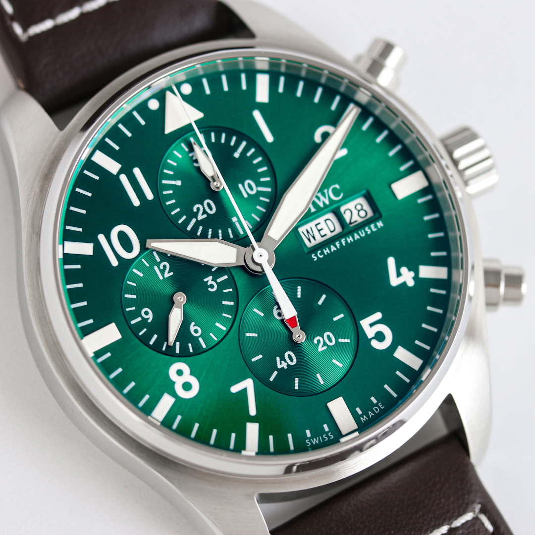 The dial design continues the classic cockpit instrument panel style of the pilot's watch, with a green and red gold combination that gives the timepiece a fresh and luxurious look.