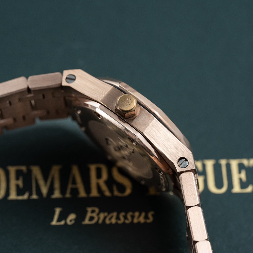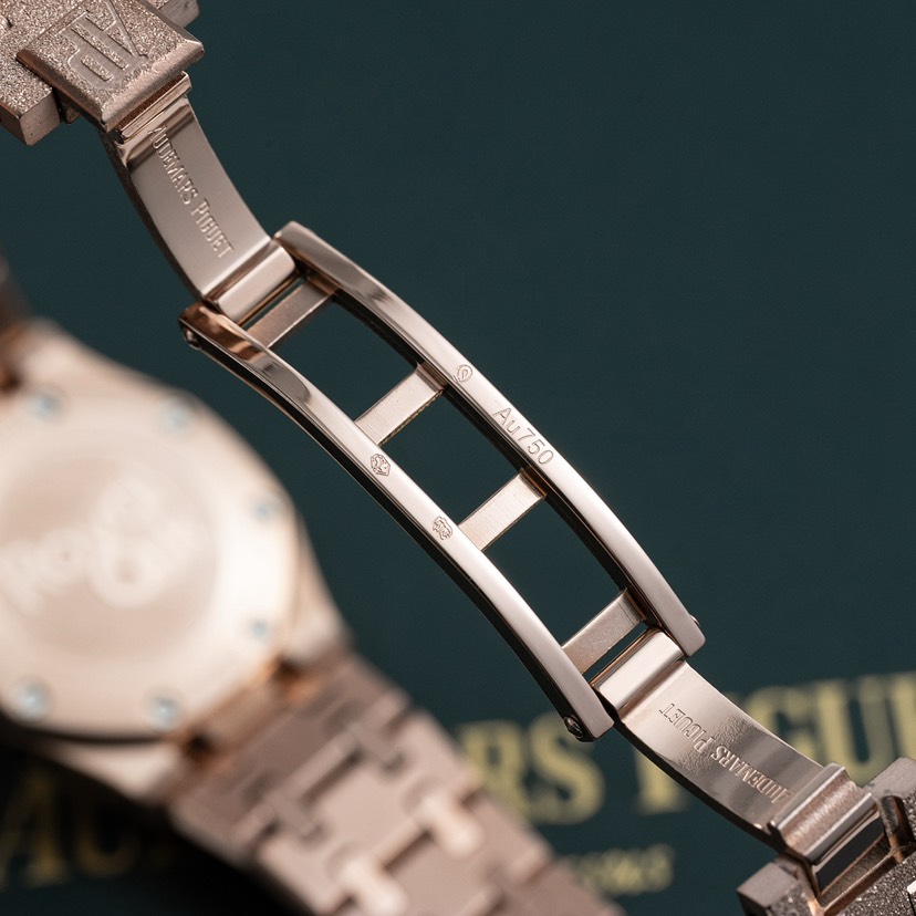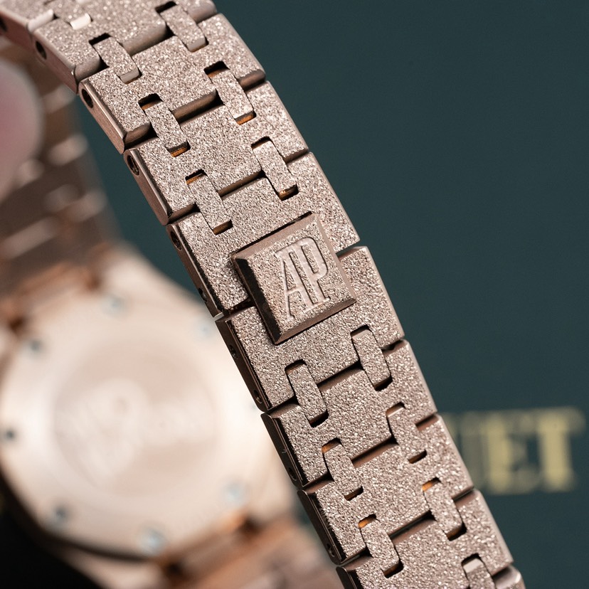 The dial features a delicate aventurine texture that shimmers subtly under light. The checkered pattern perfectly complements the classic octagonal case, while the full gold bracelet has a brushed finish, offering a subtly luxurious feel. Powered by a Swiss quartz movement and featuring a classic octagonal case, this timepiece inherits the iconic genes of the Royal Oak and is crafted entirely in 18K gold, giving it an innate air of nobility. The dial, made of aventurine, has a fine, stardust-like texture, and the checkered decoration echoes the brushed texture of the bracelet, creating a subtle sheen that diffuses in the light. Every detail, from the crown to the bracelet, reflects Audemars Piguet's obsession with "refinement."