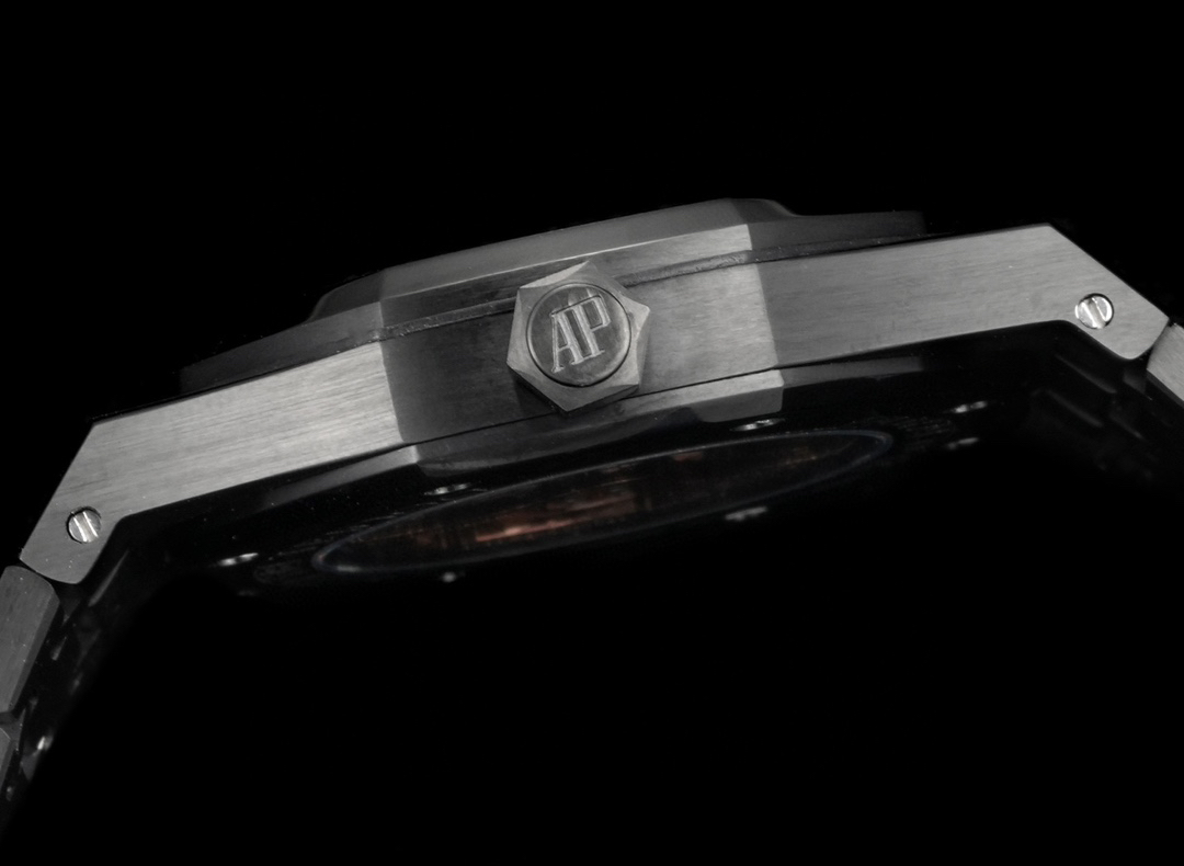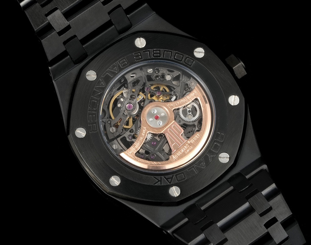 41mm diameter, 9.9mm thickness. Dark gray dial shape: round. Dial material: skeletonized dial with rose gold luminescent applied hour markers and Royal Oak hands. Crystal material: anti-reflective sapphire crystal. Crown material: stainless steel, screw-down crown. Case back: transparent, anti-reflective sapphire crystal.