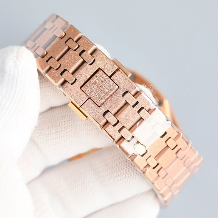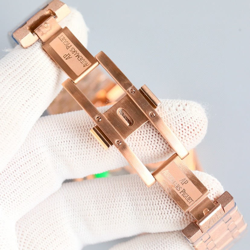 The Audemars Piguet 26574 series, known as the "King of Steel Watches" with its 41mm steel bracelet, features a meticulously crafted bracelet. The bracelet's fine brushed texture ensures it won't cut your wrist, demonstrating meticulous attention to detail. The end links, connecting to the watch head, feature a consistent, cushioned design for a more comfortable and snug fit. The clasp's opening and closing mechanism, along with its engraving, maintains a consistent aesthetic.