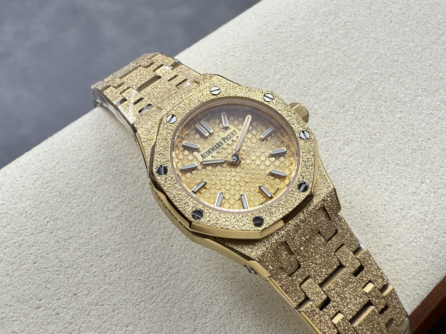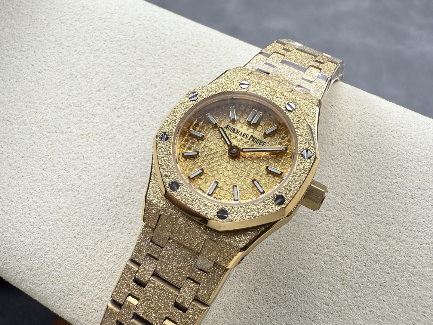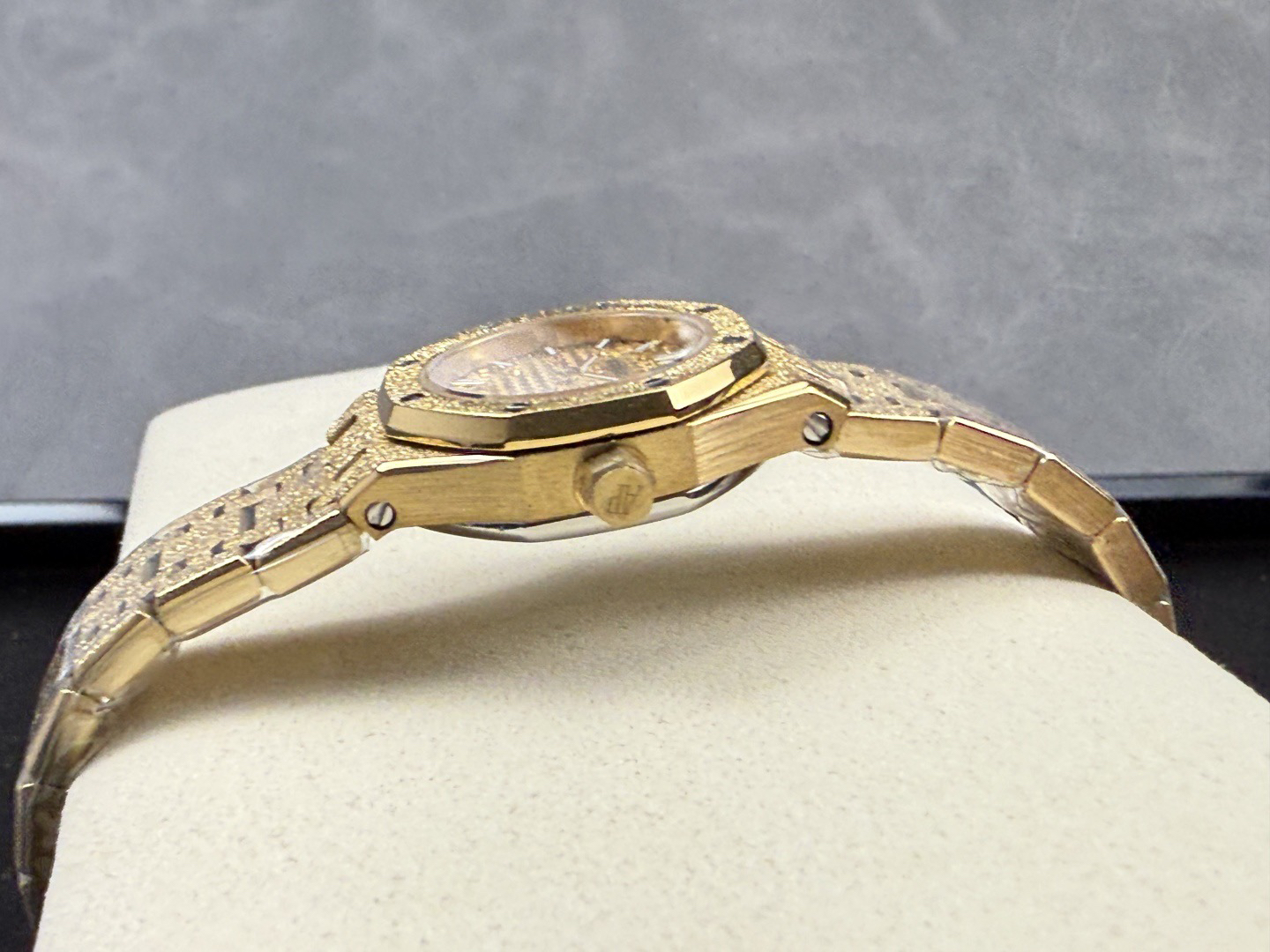 This timepiece interprets classic design in three precious metals: yellow gold, rose gold, and white gold. The case, bezel, and bracelet are seamlessly integrated, featuring Audemars Piguet's signature frosted gold finish. Fine, intricate grooves are hammered into the gold surface using diamond tools, creating a starburst effect under light, nearly mimicking a fully diamond-encrusted watch. With its compact 23mm diameter, from the meticulous craftsmanship to the overall quality, it exudes sophistication on the wrist, inviting you to appreciate the artistry of a top-tier timepiece!