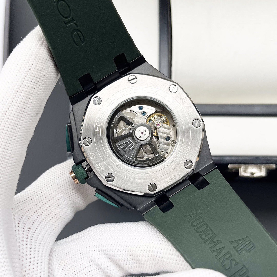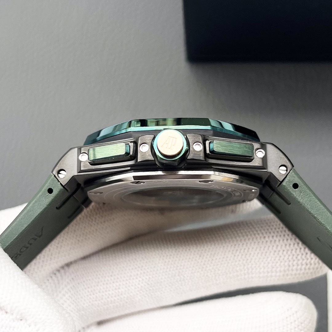 Automatic mechanical movement, 316L stainless steel case, ultra-high hardness crystal glass, 100-meter water resistance, 44mm case diameter, 14.4mm thickness, dial features Audemars Piguet's exclusive "méga tasserie" oversized checkered pattern, creating a strong three-dimensional effect, the entire case is CNC machined, and the strap is made of rubber.