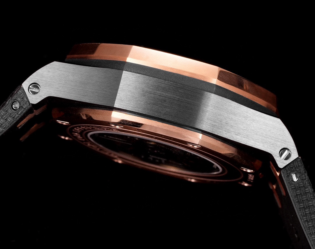 Crest: Hexagonal ceramic crown with brushed finish