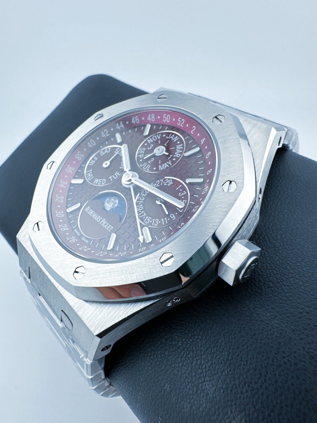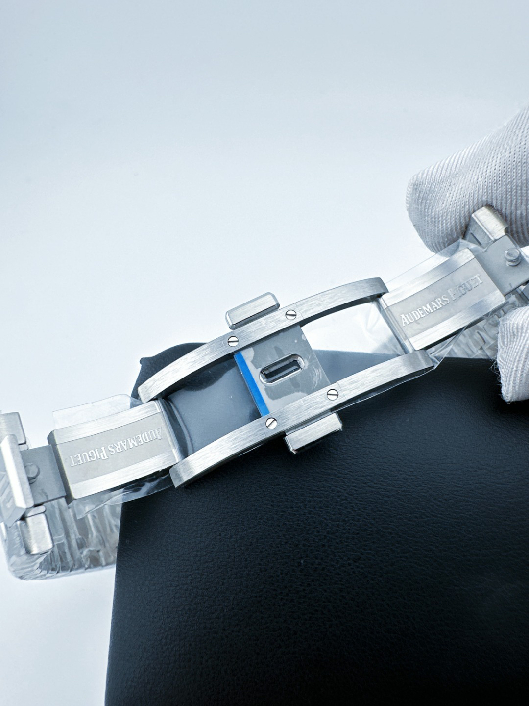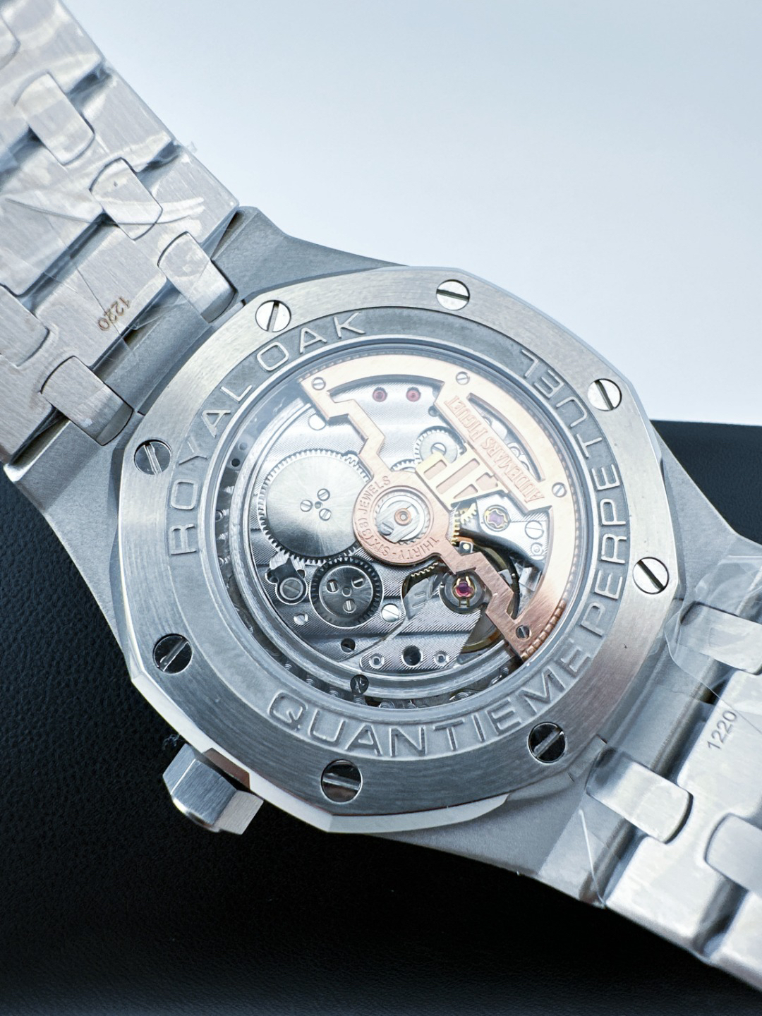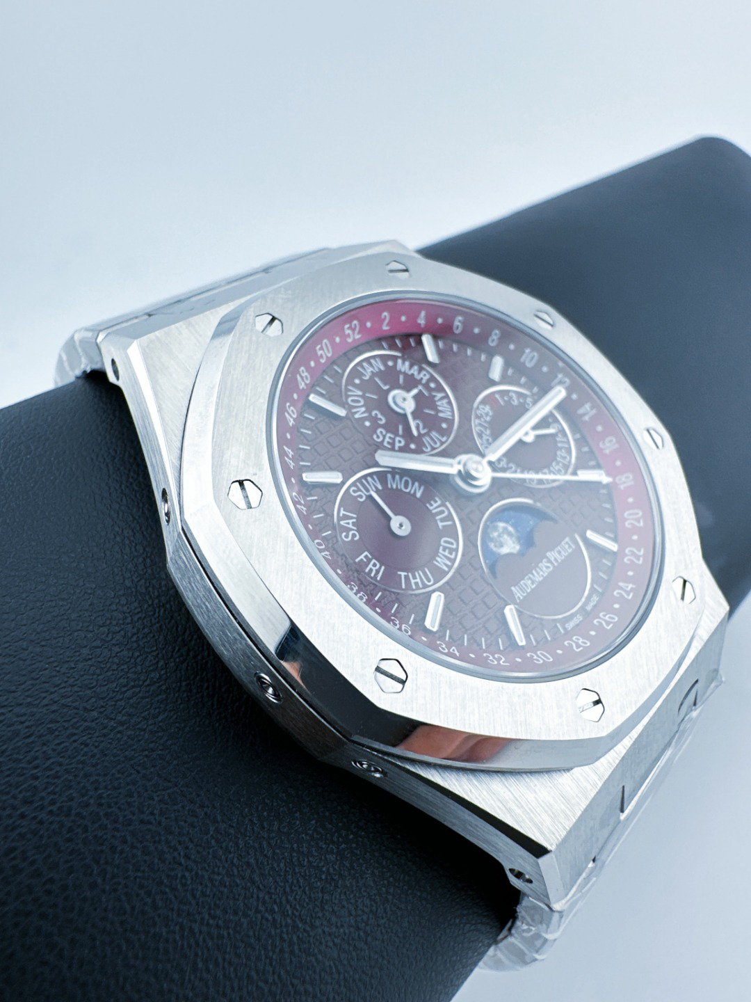 The case is crafted from 316L stainless steel, measuring 41mm in diameter and 11.4mm in thickness. The blue dial features a large "Grande Tasserie" pattern, paired with applied hour markers and faceted hands coated with luminescent material. Three subdials are symmetrically arranged on the dial, displaying the date, hour, minute, day of the week, date, calendar, month, moon phase, and leap year information. The sapphire crystal is treated with an anti-reflective coating for enhanced clarity and brightness.