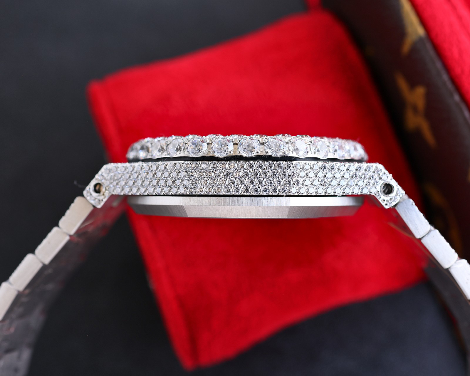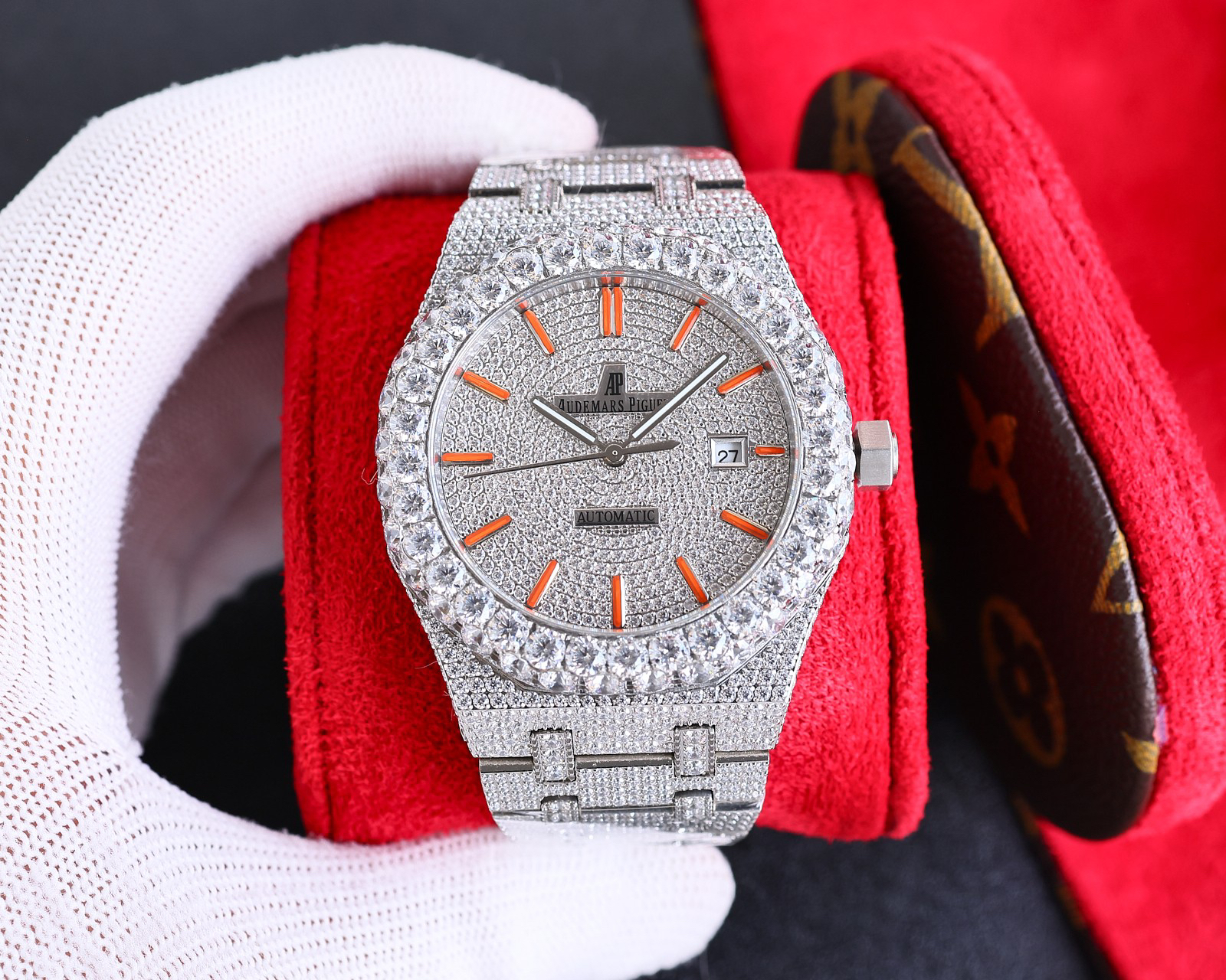 This men's automatic mechanical watch, part of the Royal Oak 50th Anniversary series (model 15510), features a brand-new bezel with a large diamond-set bezel and an imported modified 324 movement. It boasts a 316L stainless steel case, a solid, heavy-duty steel bracelet, and select imported diamonds for a dazzling and precise timekeeping experience. Hand-set with diamonds, this exquisite men's watch exudes elegance and sophistication, looking stylish and versatile. A timeless classic design, it's made of 316L steel with an imported leather strap. Dimensions: 42mm x 12mm.