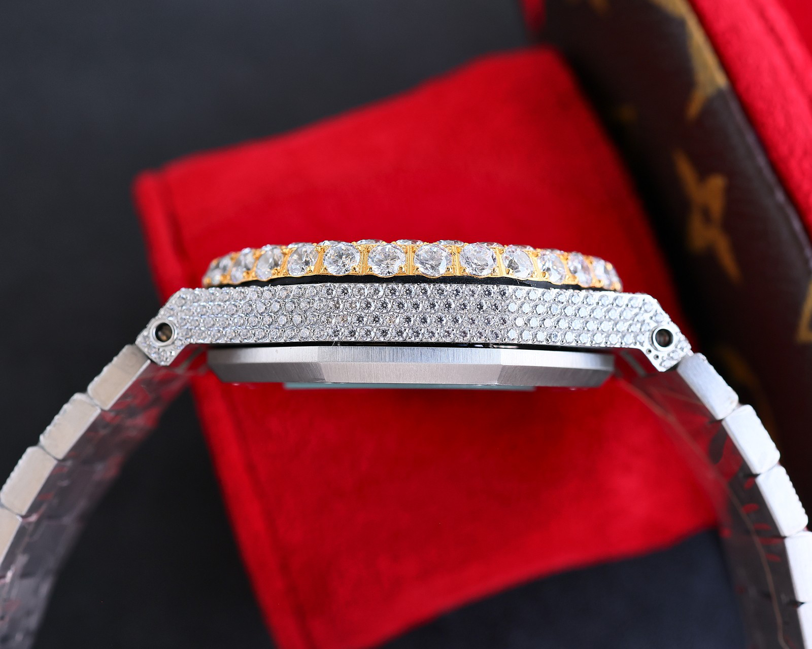 This men's watch features a brand-new bezel with a large diamond-set bezel, and is powered by an imported modified 324 movement. It's a fully automatic mechanical watch, part of the Royal Oak 50th Anniversary series, model 15510. It boasts a 316L stainless steel case, a solid, heavy-duty steel bracelet, and select imported diamonds for a dazzling shine and accurate, stable timekeeping. The watch is meticulously hand-set with diamonds, exuding elegance and sophistication. A timeless and stylish timepiece, it complements any outfit. Made with 316L steel and an imported leather strap.