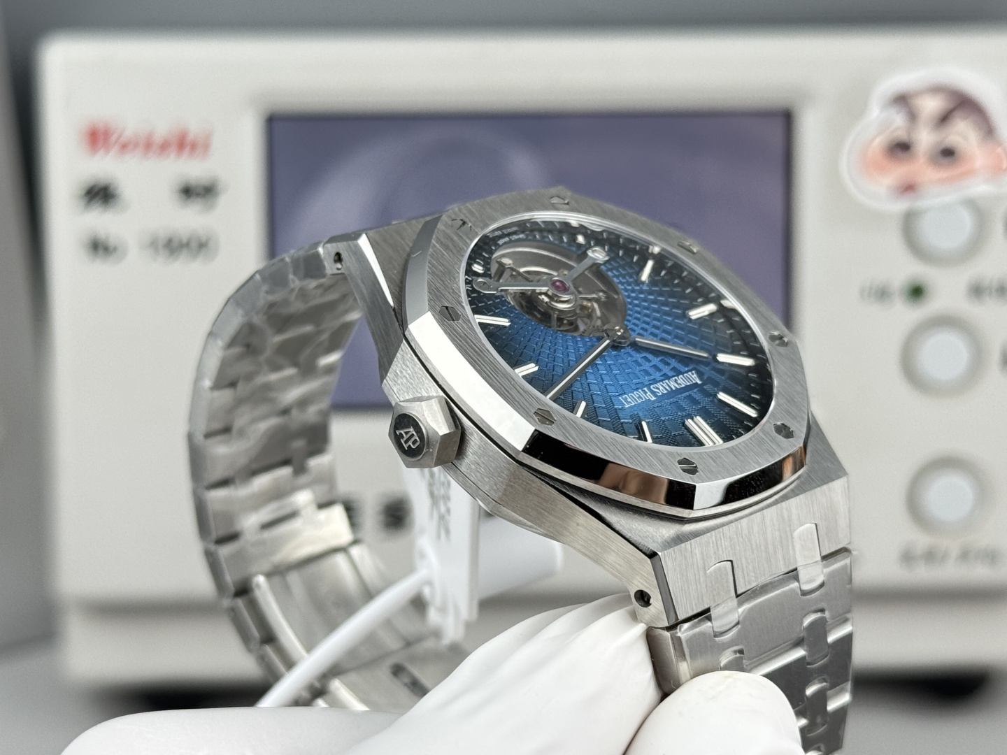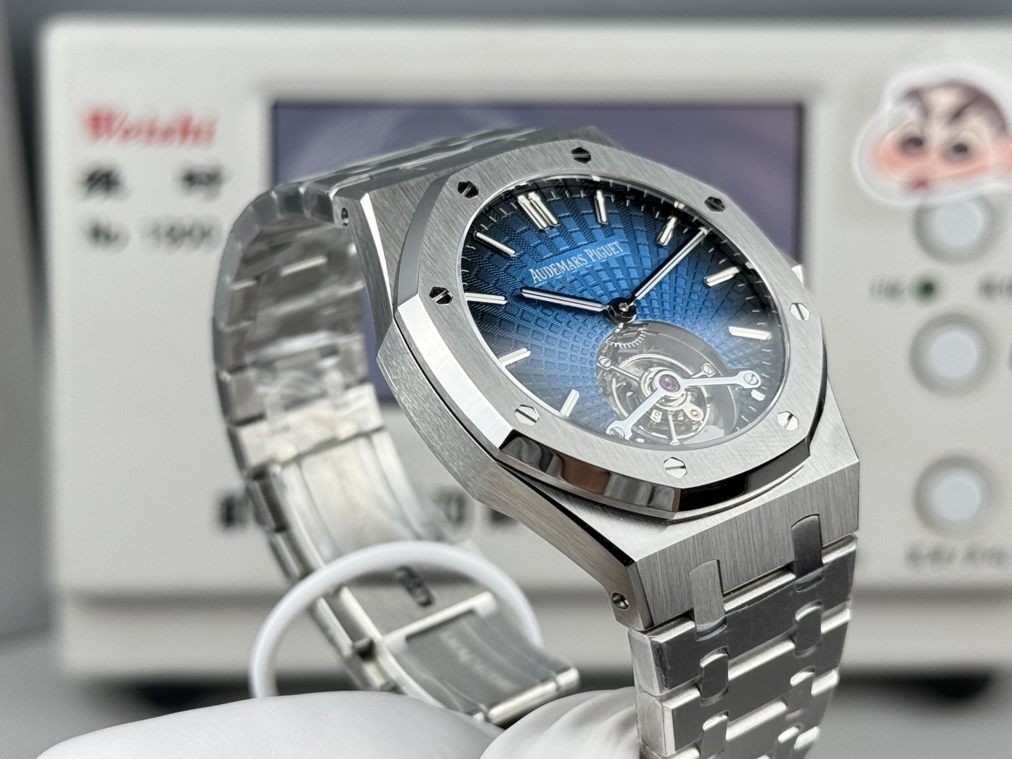 Audemars Piguet retains its signature octagonal bezel, iconic hexagonal screws, and classic bracelet. The Royal Oak Ultra Thin Tourbillon watch innovates upon the classic "Tapsisserie" pattern, creating a new "Tapisserie Evolutive" pattern. This familiar yet novel dial pattern offers a fresh look and becomes the highlight of the timepiece. The case measures 41mm in diameter and 11.2mm in thickness, housing a remarkable tourbillon.