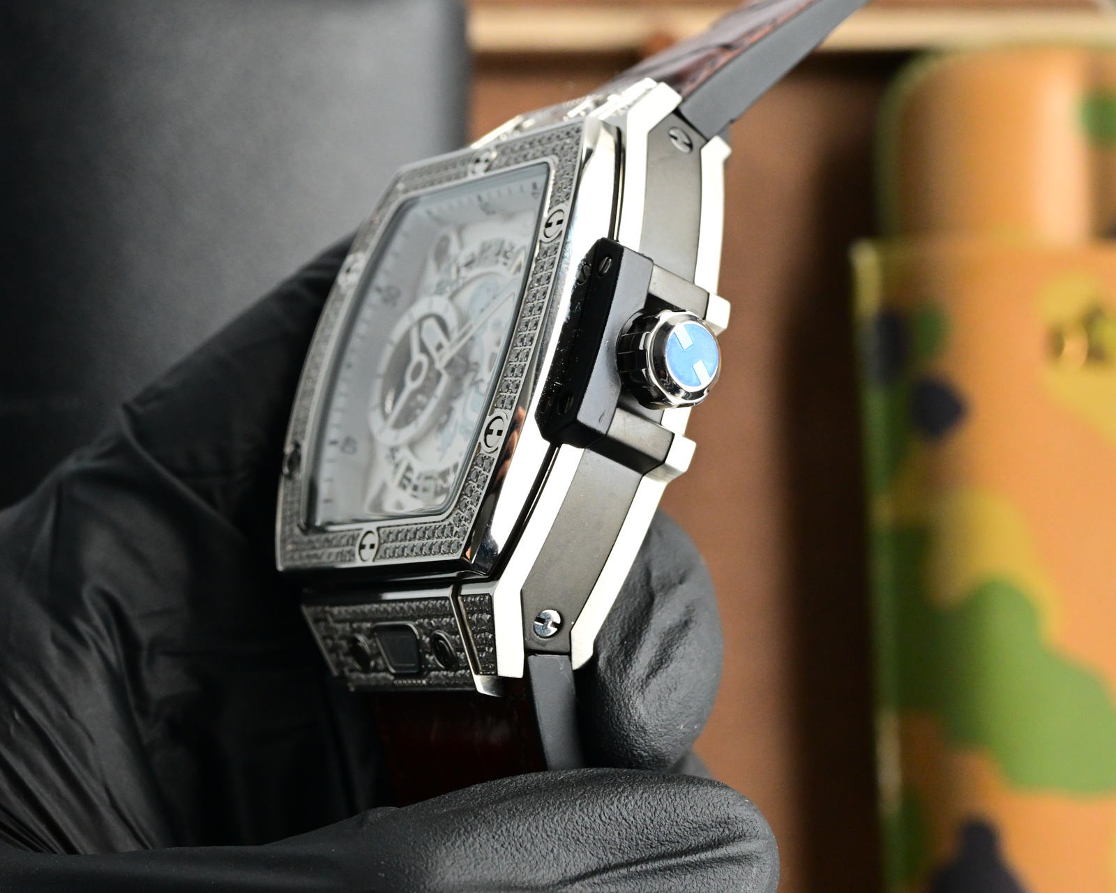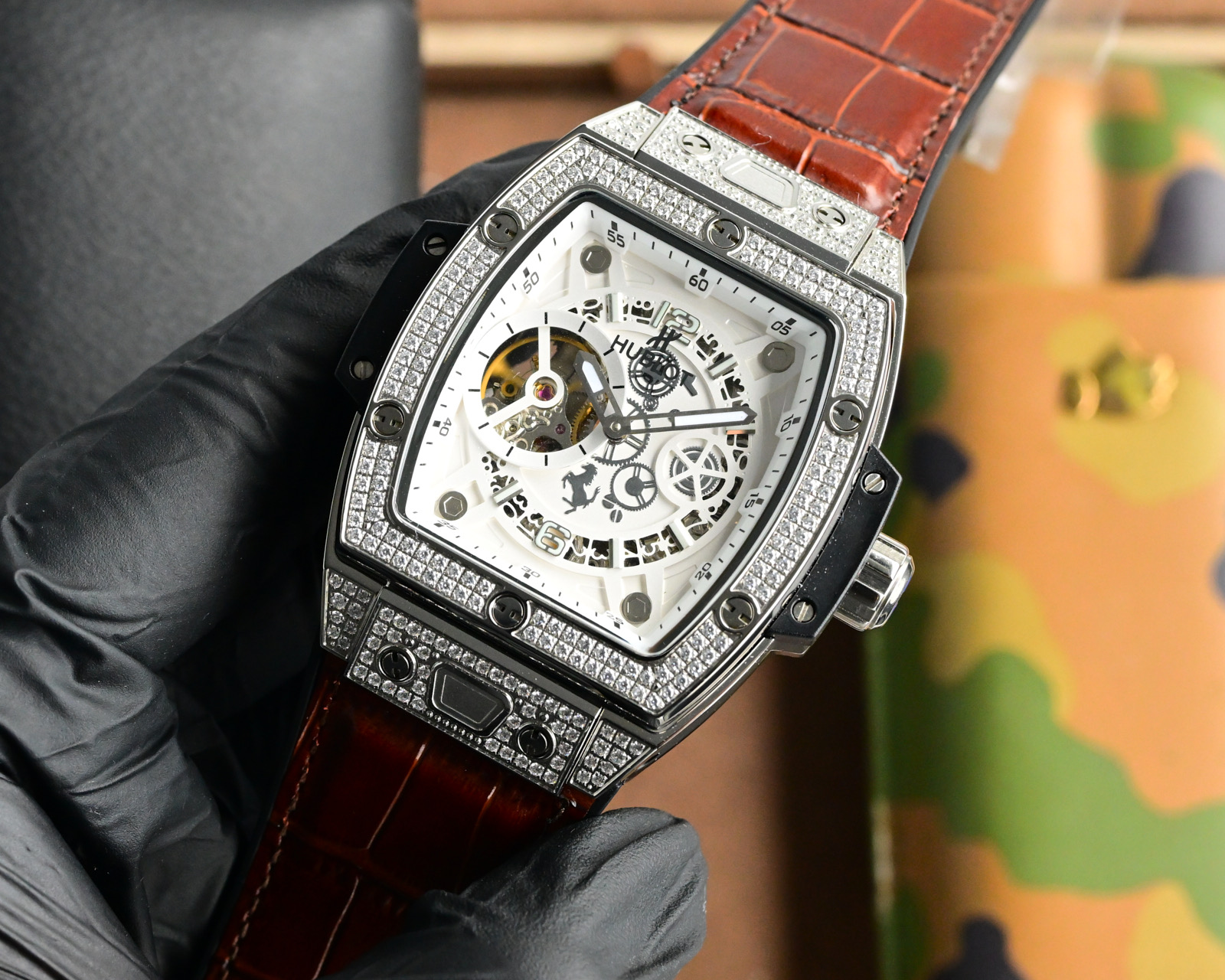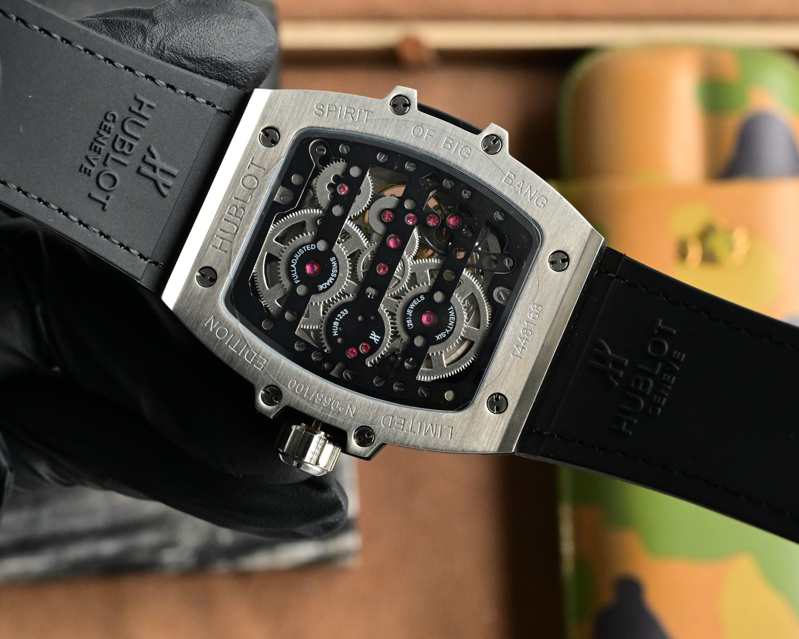 High-end custom-designed fully automatic mechanical skeletonized movement; the tourbillon, clearly visible at the 9 o'clock position, spins continuously, exuding dynamism.