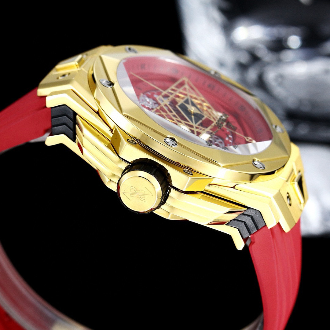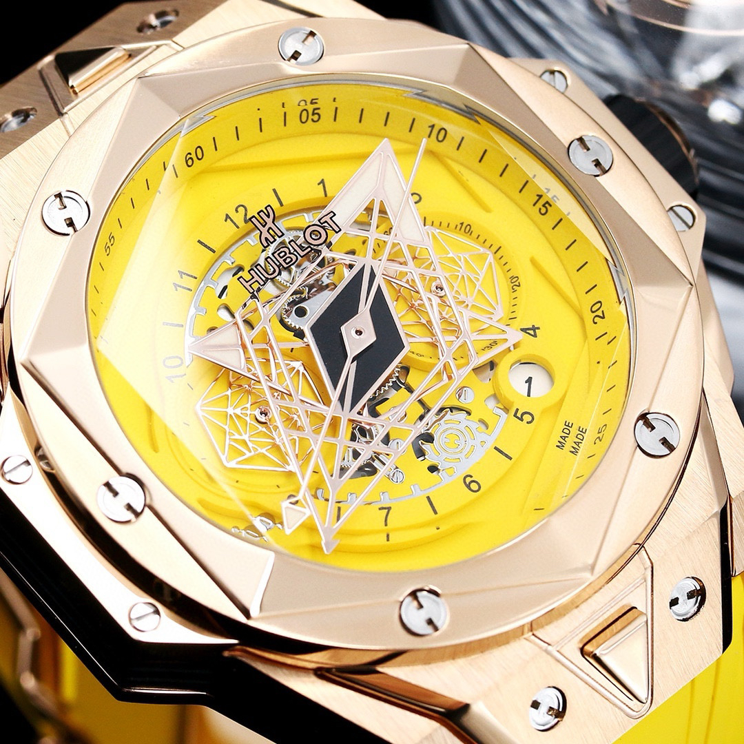 A groundbreaking breakthrough in the most complex steel case craftsmanship in history. Utilizing three-dimensional geometric shapes, it presents an exquisite relief effect and profound texture, perfectly interpreting the relentless pursuit of linear aesthetics. The case is made of 12 ceramic pieces, polished, satin-finished, sliced, engraved, beveled, and faceted, presenting alternating hexagons, rhombuses, and triangles, creating a harmonious and captivating visual effect. It comes standard with a custom-made Hublot imported VK chronograph movement, the only one in the industry with a matching skeletonized date ring and window at 4.5 o'clock. The half-tooth crown with its tattooed logo always points upwards. The iridescent hands have an impeccable texture. 45mm.