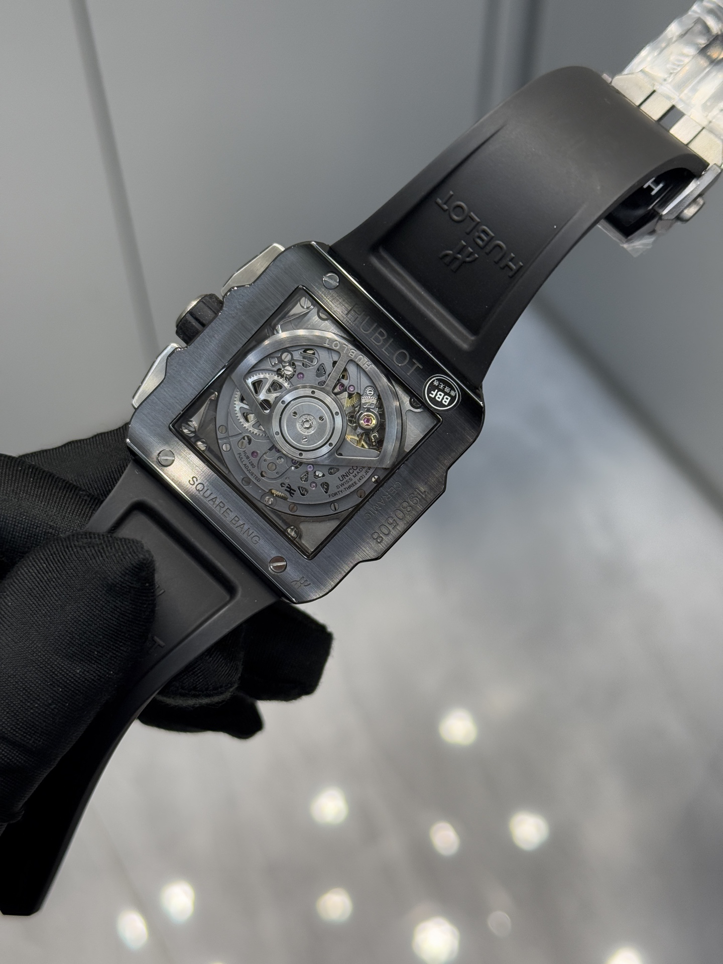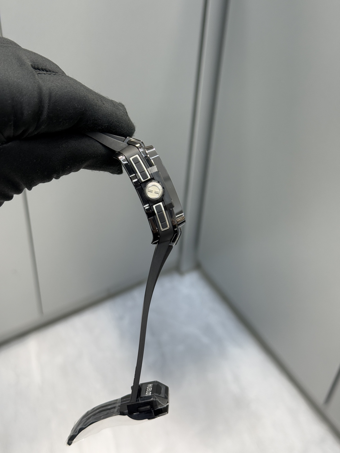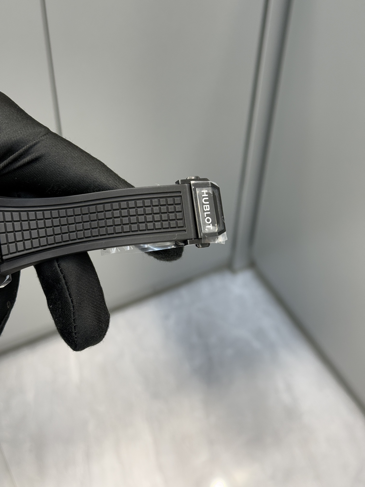 Crafted from Grade 5 titanium, this timepiece is lightweight and comfortable against the wrist. It features a high-transparency sapphire crystal dial with bridge-shaped sapphire crystals on both the upper and lower sections. The watch boasts a textured rubber strap inspired by the Big Bang series and a market-acclaimed one-click quick-release system. It houses the exclusive Hublot HUB1280 movement, with a clearly visible column wheel at 6 o'clock. A fully skeletonized date ring and a dual chronograph sub-dial design replace the traditional dial, offering a clear view of the intricate workings of the movement. The iridescent hands possess an impeccable quality. 42mm.