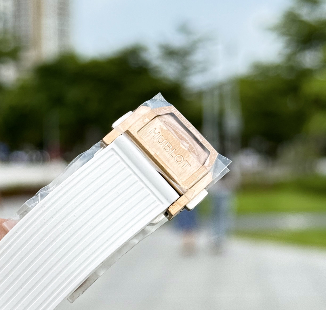 Seven hues discovered by Isaac Newton are enhanced by the shimmering, purplish-red glow of pink sapphires. The bezel, set with 48 baguette-cut colored gemstones, outlines the dial's smooth contours, bringing the total number of colored gemstones (362) to 362. The interplay of light and color causes the gemstones to display different hues, capturing the vibrant rainbow. The watch features Hublot's "One-Click" quick-change strap system, allowing for easy and rapid strap changes with the touch of a button, instantly showcasing a unique style and witnessing every romantic moment in life.