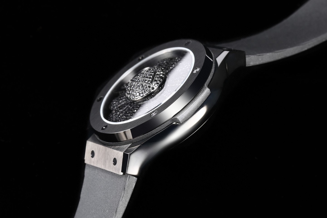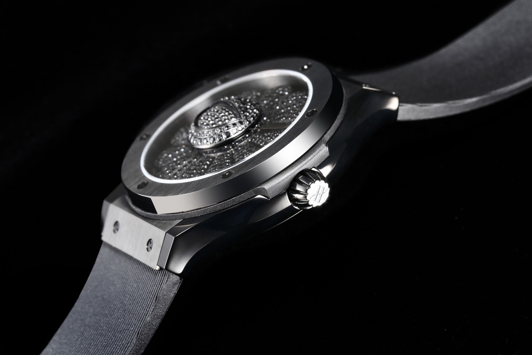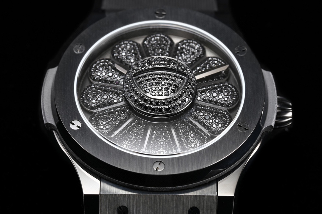 Dial: Black lacquered dial with rotating decoration of 12 black-plated petals set with 456 black diamonds