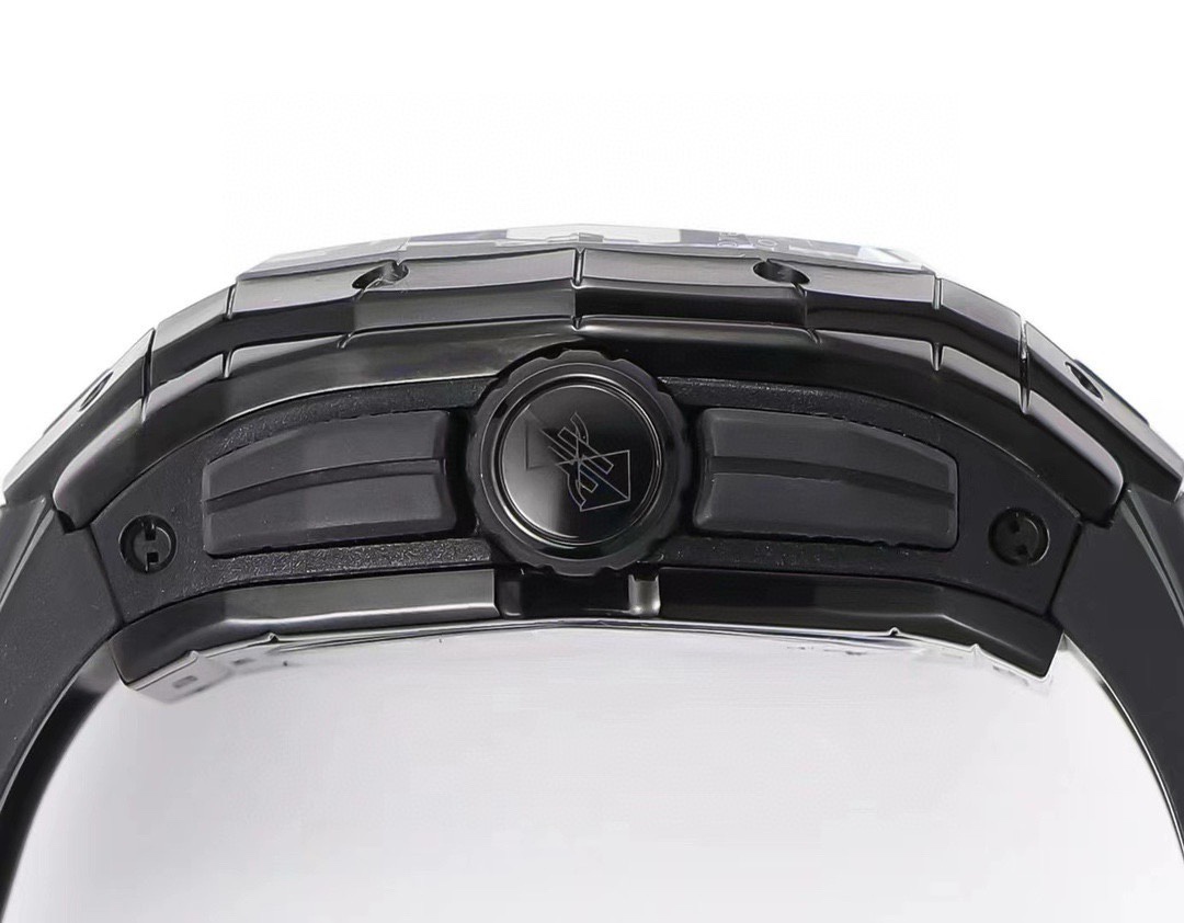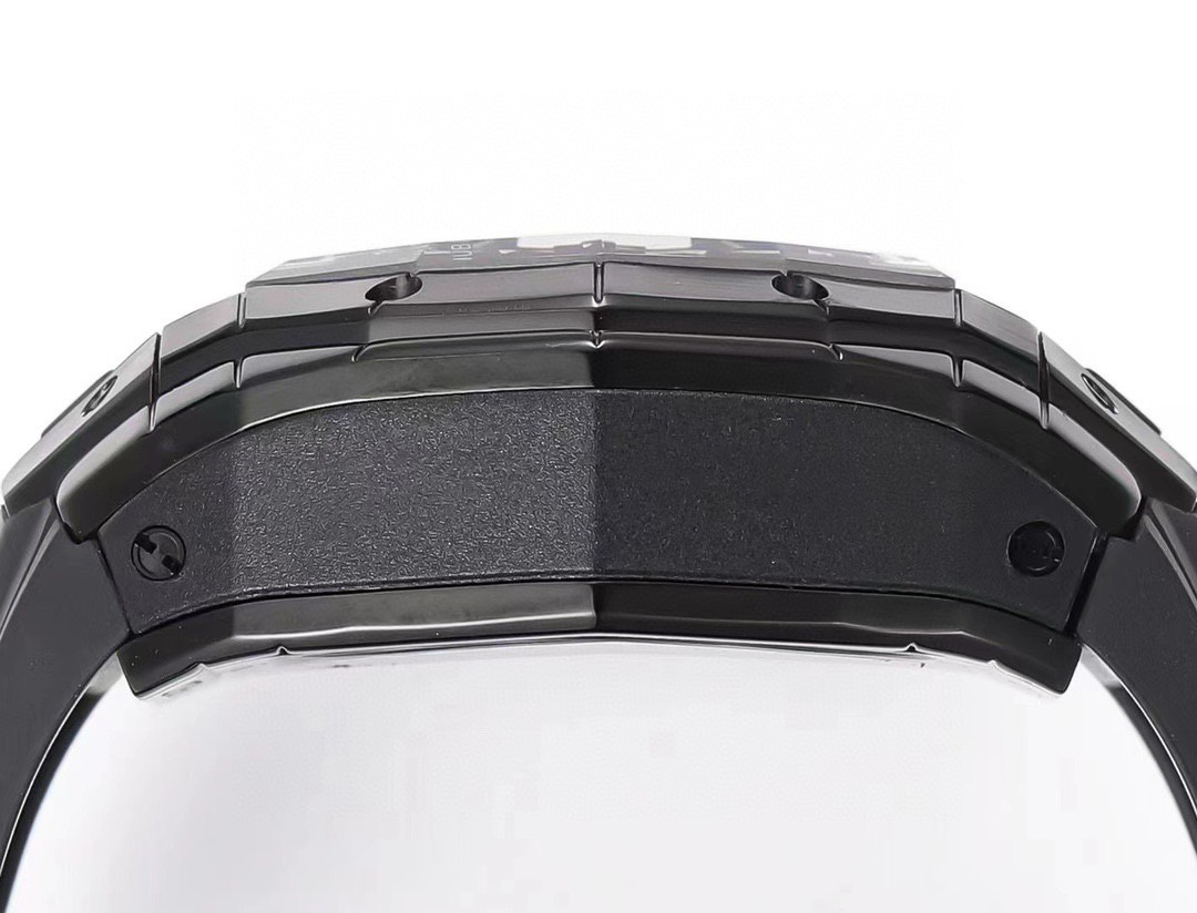 Six H-shaped titanium screws run through the bezel, the case features a color-blocked sandwich construction, the signature lugs on either side of the case, and a pressure-molded rubber crown.