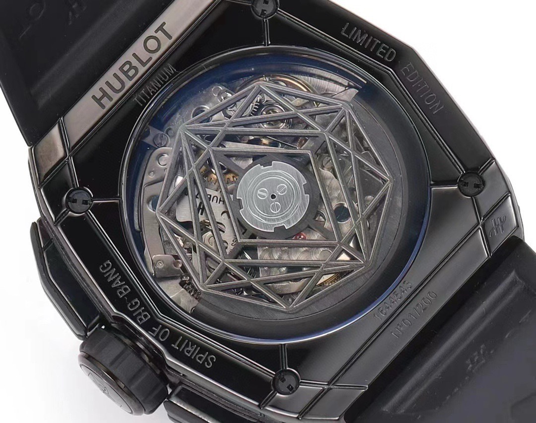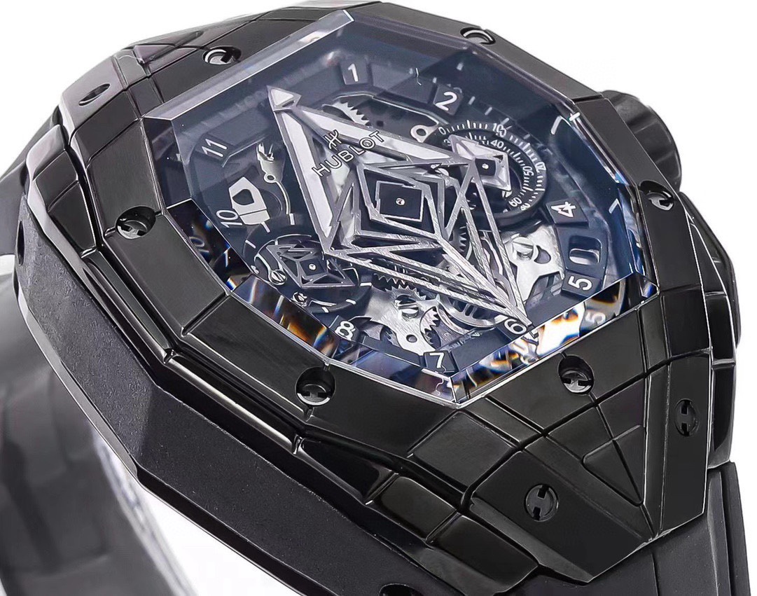 From the case to the bezel, geometric tattoo patterns overlap and interplay, showcasing the extraordinary charm of tattoo art. On the sapphire crystal dial, the mechanical beauty of the Hub 4700 automatic skeletonized chronograph movement can be appreciated through the disc hands. The disc hands also feature a geometric design, a signature feature of Hublot's collaboration with the Sang Bleu tattoo studio.