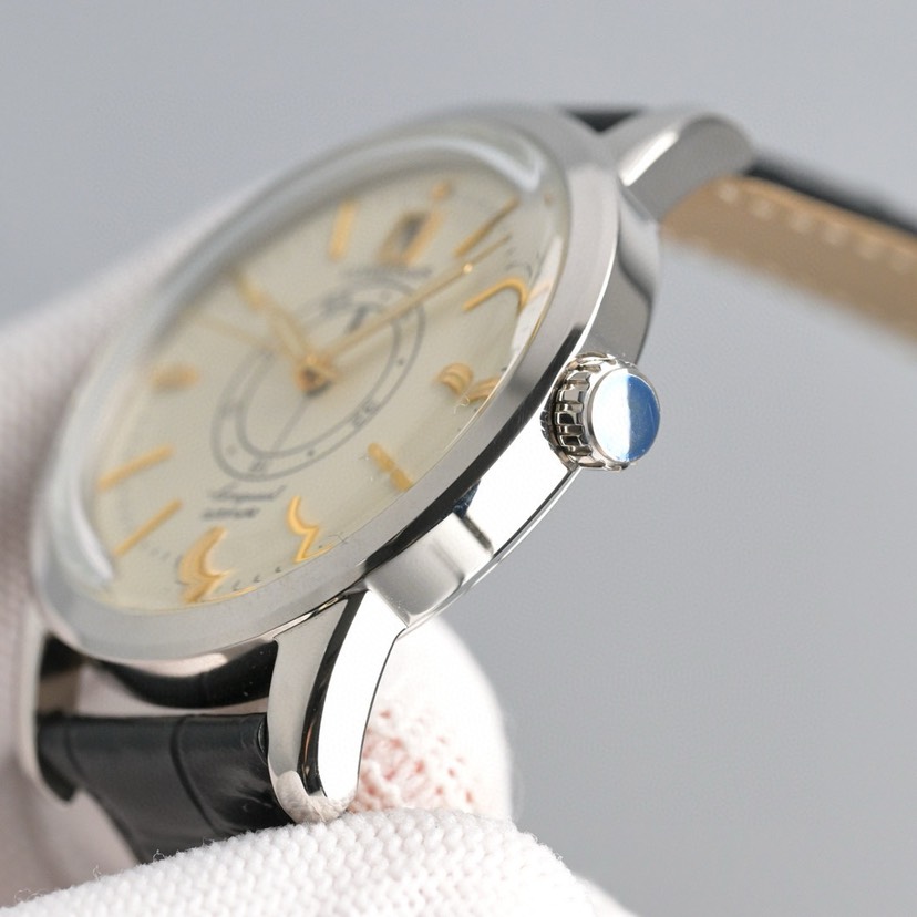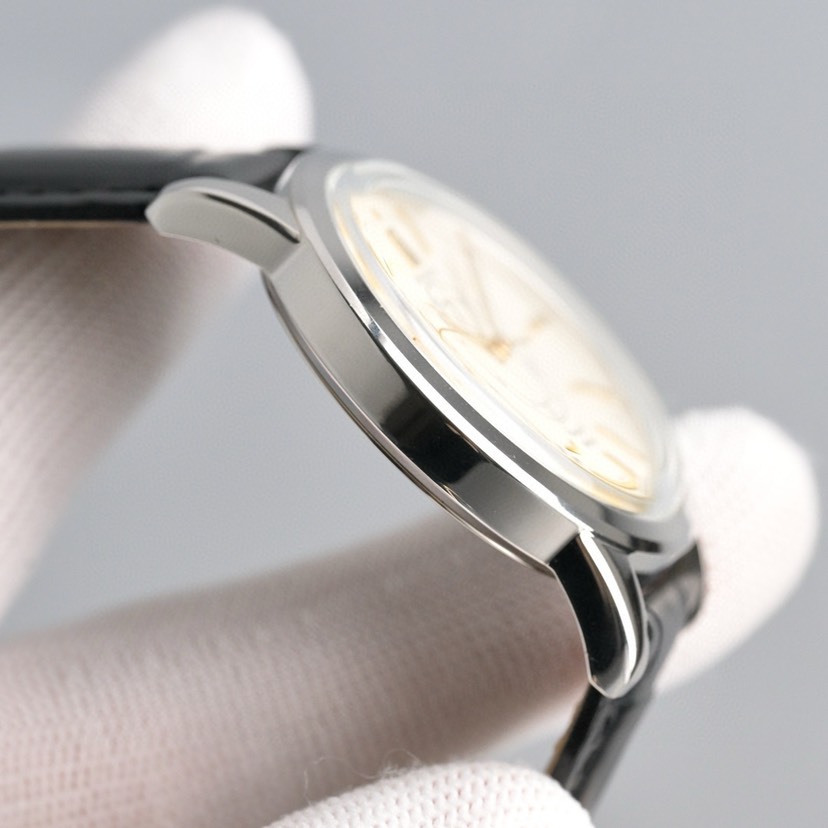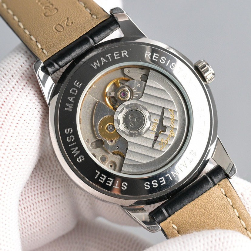 The date display window is a major highlight of this watch. Inspired by Longines' famous "Cyclops" design, it's positioned below the 12 o'clock position on the dial, making it highly recognizable. As a classic model, this watch has a 40mm case, retaining a vintage style while conforming to modern aesthetics. It houses the imported 9015 movement. The front and back glass are made of sapphire crystal, enhancing scratch resistance and durability while preserving the vintage charm of the classic series. The Italian calfskin strap provides a comfortable fit on the wrist, and the folding clasp is engraved with the classic Longines logo.