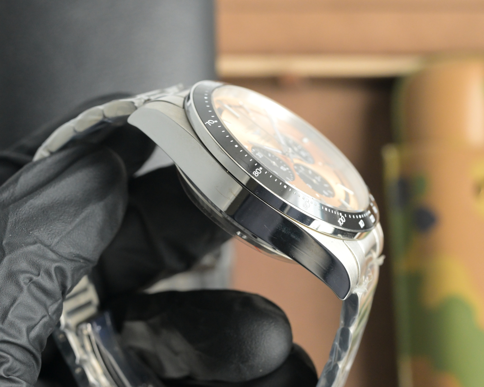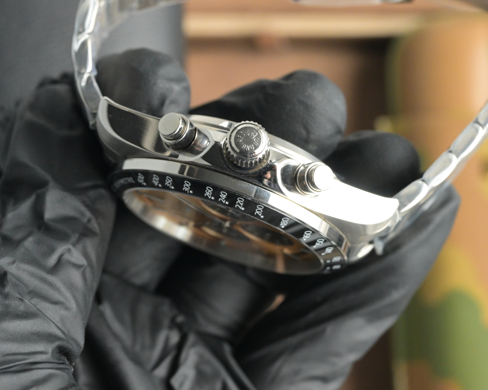 The ceramic bezel has slightly rounded edges.