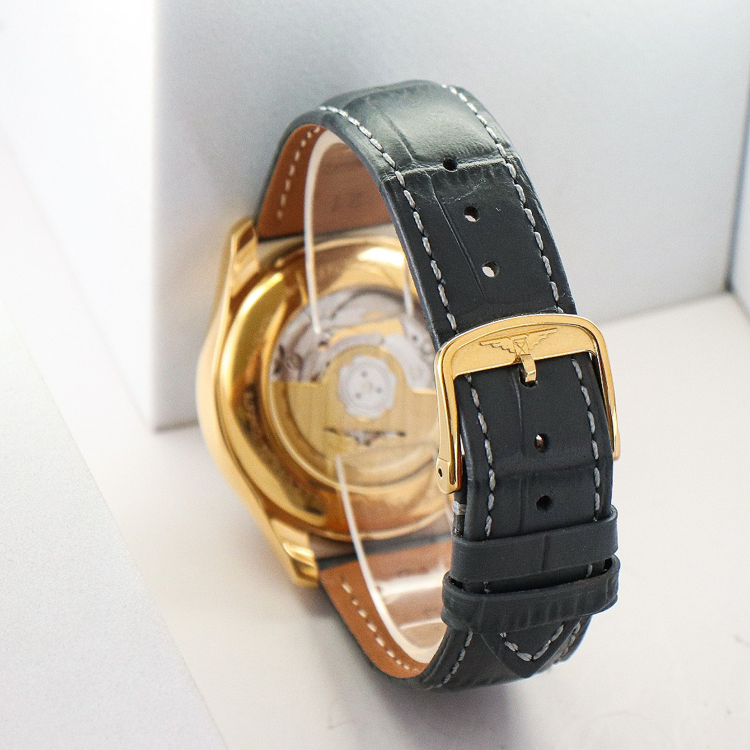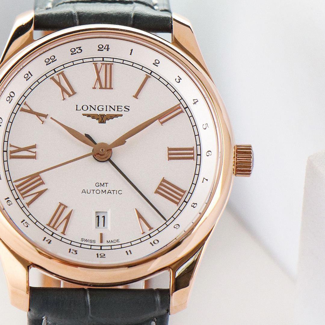 This newly designed watch features a refreshed Roman numeral dial, combining luxury, sophistication, and practicality. The movement utilizes an imported 2836 integrated GMT dual time zone, ensuring synchronized and precise timekeeping. The watch has a 40mm diameter and features an anti-reflective sapphire crystal. The leather strap is made of imported Italian grey top-grain calfskin. The Roman numerals are more vibrant, adding visual depth, while the black hands clearly display the GMT function. Master Collection watches have always been renowned for their timeless classic style and understated elegance.