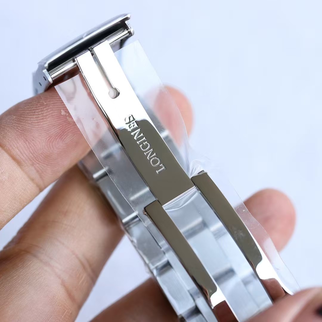 The detachable three-link stainless steel bracelet features a refined structure in each component, custom spring bars, and interchangeable end links, demonstrating meticulous attention to detail.