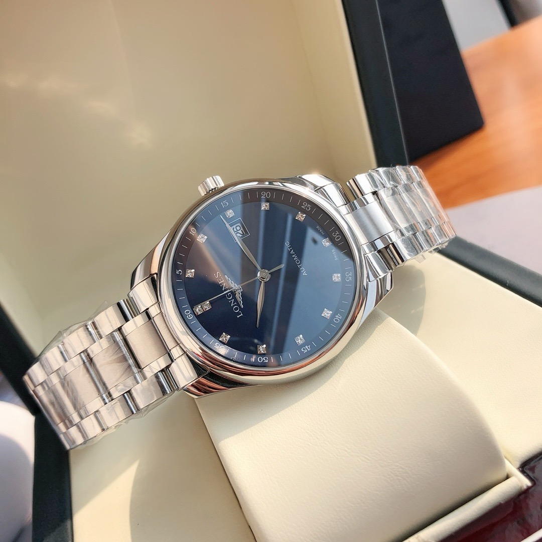 With a 40mm case diameter, this watch features a silver triple-folding safety clasp with a push-button opening mechanism, and a transparent case back showcasing the Swiss automatic mechanical movement. Water-resistant to 30 meters, it is set with 13 top-grade Wesselton VS-SL diamonds totaling 0.059 carats, each with a diamond clasp. The hands are silvered and polished, and the crystal is made of scratch-resistant synthetic sapphire. Elegant diamond numerals adorn the hour markers, complementing the clean and beautiful central blued steel hands. The movement is a Swiss SW200 chronometer-certified automatic mechanical movement, the highest grade.