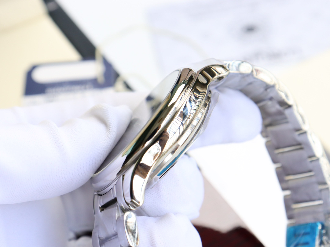 The stainless steel case is flawless, with a superb polishing process, maintaining meticulous quality and setting a new industry standard. The three-dimensionality of the markers and the chamfered details are both perfectly executed.