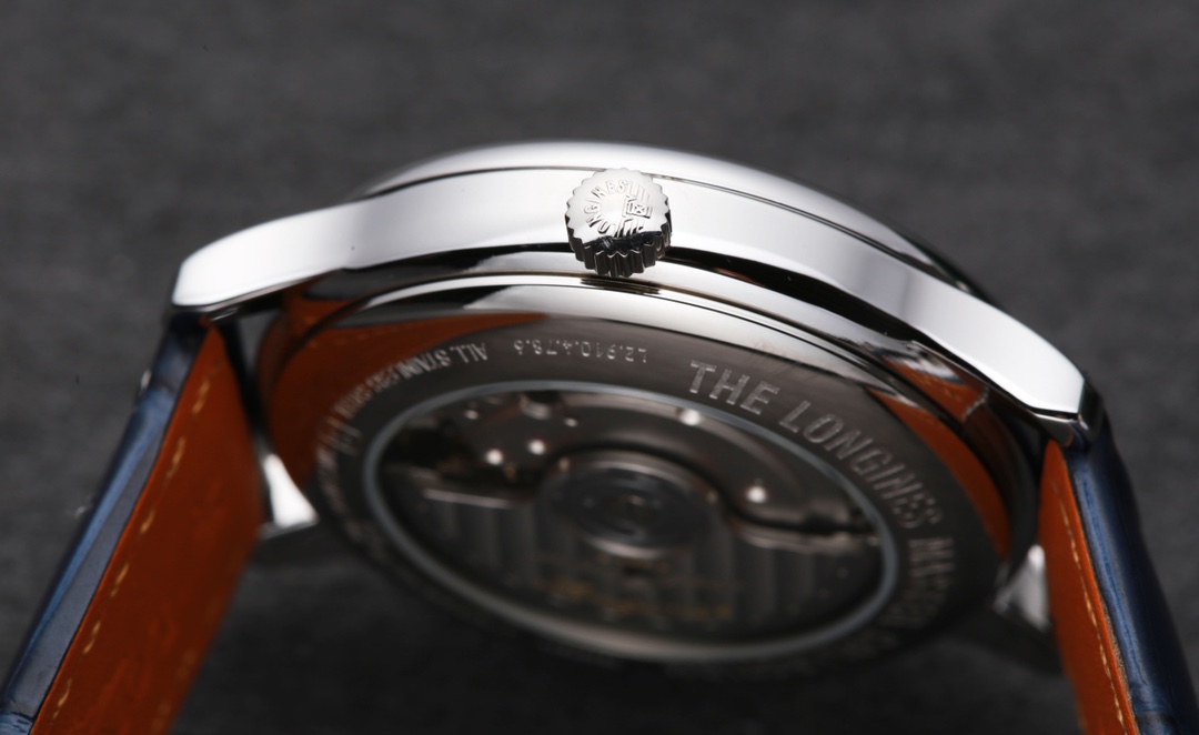 The Master Collection men's watch measures 39.8 x 11.9 mm. It features a slim, rounded case (water resistant to 120 meters), smooth, rounded sides (exquisitely crafted), sapphire crystal glass, and a Japanese Citizen 8215 movement.