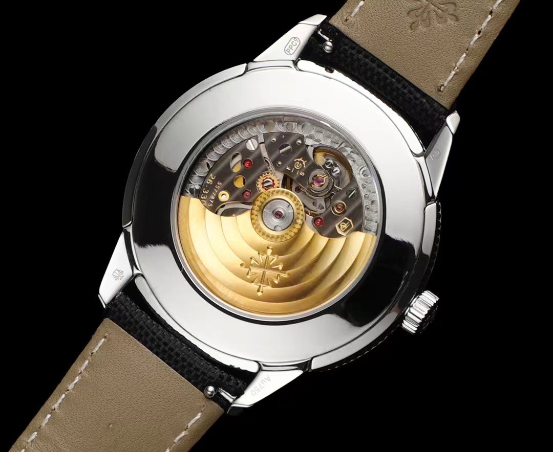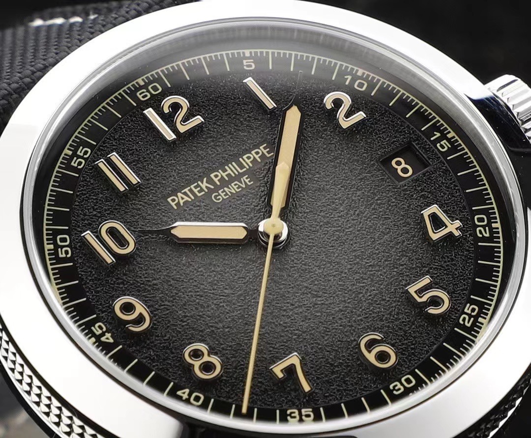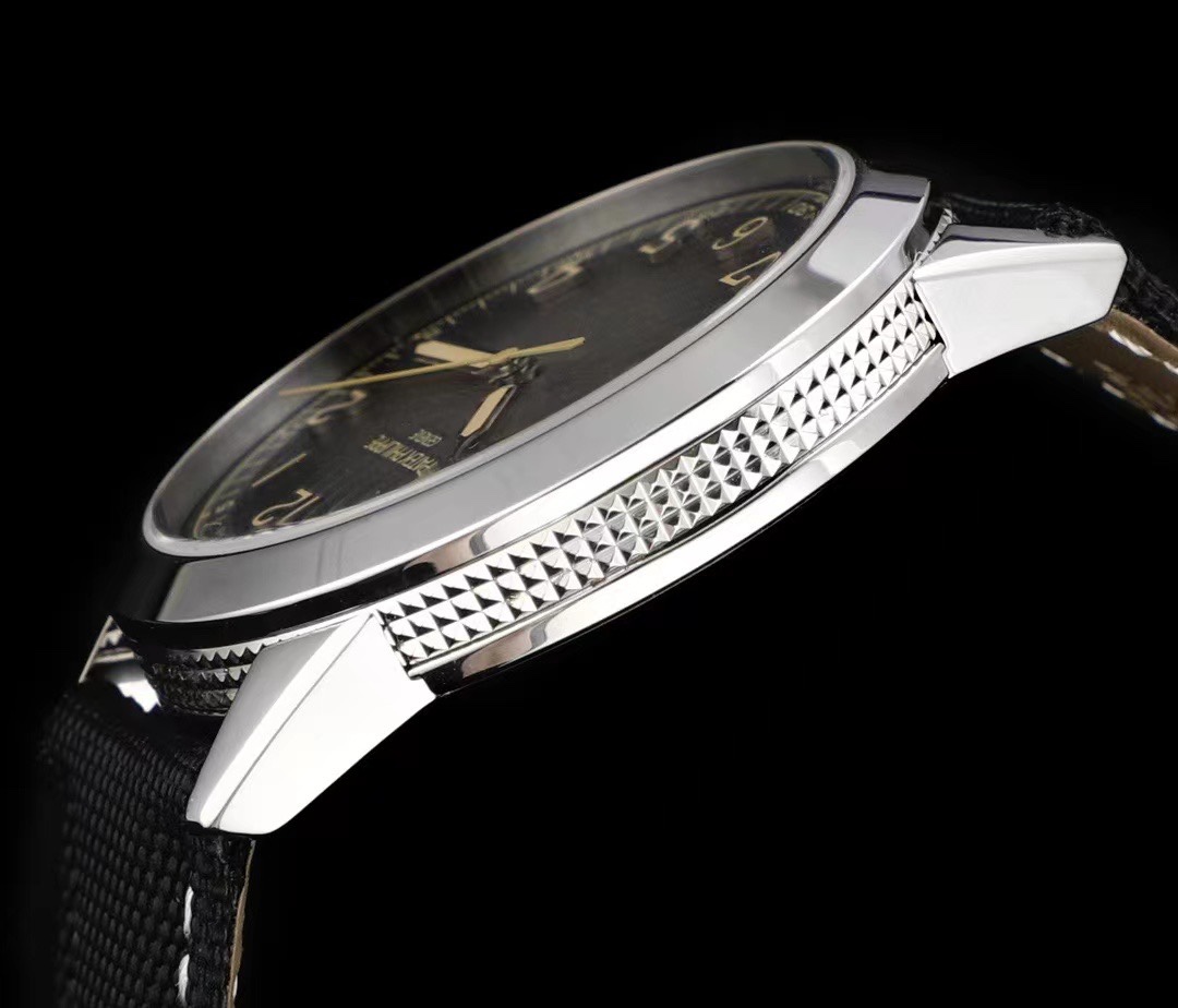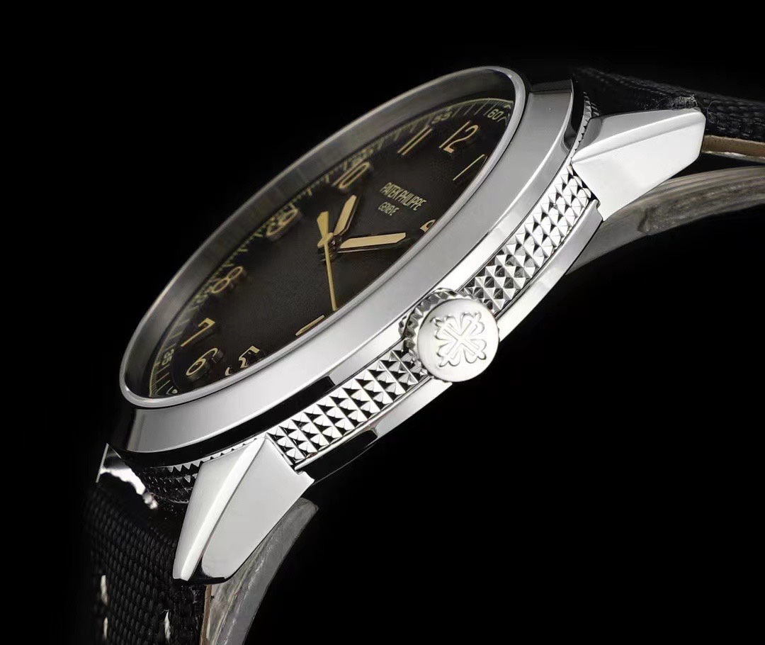 The charcoal gray dial exudes a vintage charm, with a black gradient effect at the edges and a subtle grain reminiscent of antique camera cases. The dial features white gold applied numerals with a beige luminescent coating and understated "railroad track" style seconds markers. The white gold cylindrical hour and minute hands are also coated with a beige luminescent material. A date window with beige numerals and a black background is located at the 3 o'clock position.