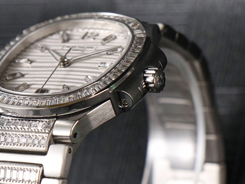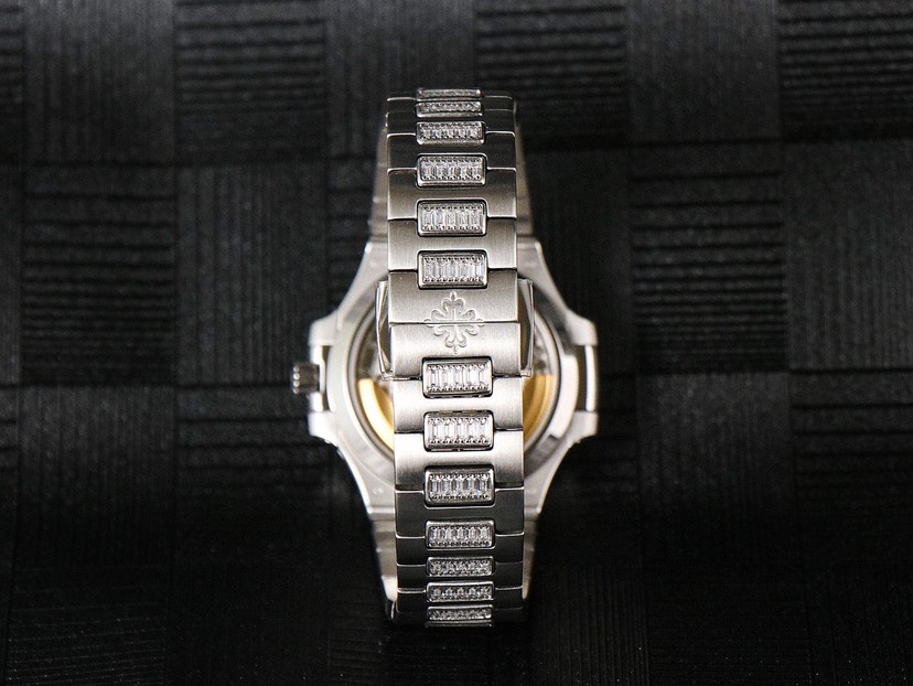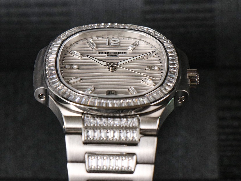 Dial: T-shaped diamonds, date window at 6 o'clock Case: White gold/rose gold with T-shaped diamonds, sapphire crystal case back. Water resistant to 30 meters. Diameter 35.2mm Bracelet: With logo skeletonized clasp Top-of-the-line Nautilus Ultimate Sport Elegance Series Watch