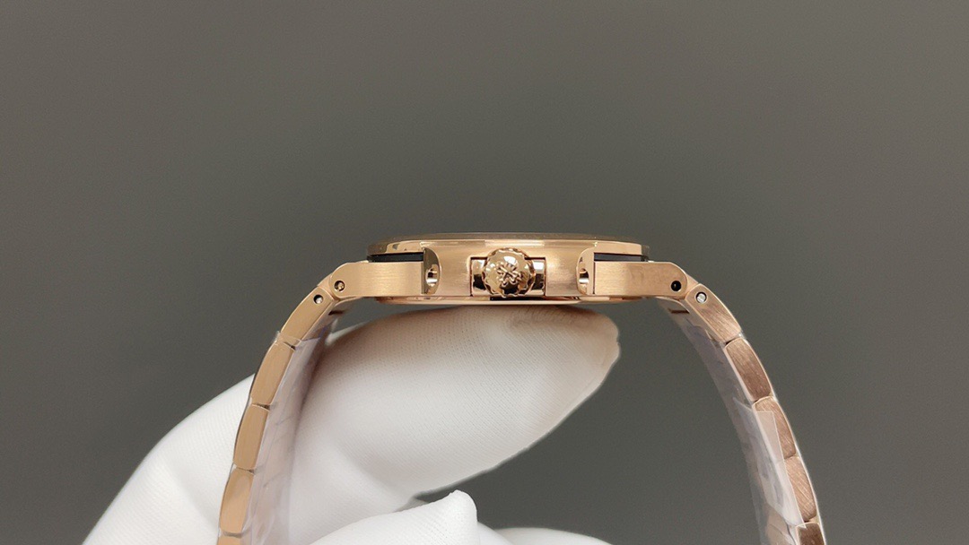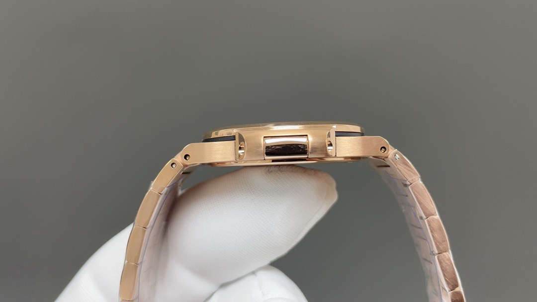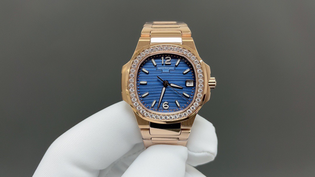 32mm diameter, 6.9mm thickness. Powered by a Swiss-made quartz movement. This Nautilus women's watch not only possesses the elegant sporty style of a men's watch but also adds a touch of femininity, making it more individualistic and fashionable, and one of the most popular women's watches today! The 316L stainless steel case is set with 46 brilliant-cut Orbold diamonds, and its 6.9mm thickness truly makes it as thin as a cicada's wing, bringing an extraordinary tactile and visual experience, and presenting a dazzling luster.