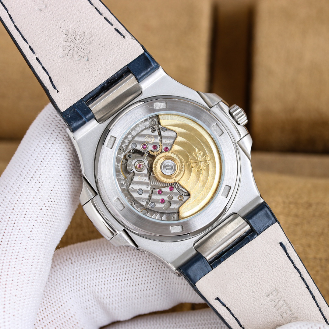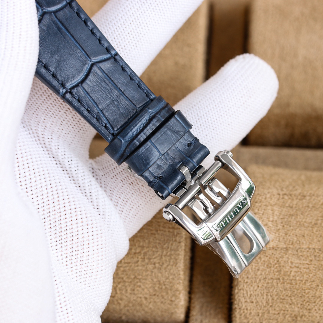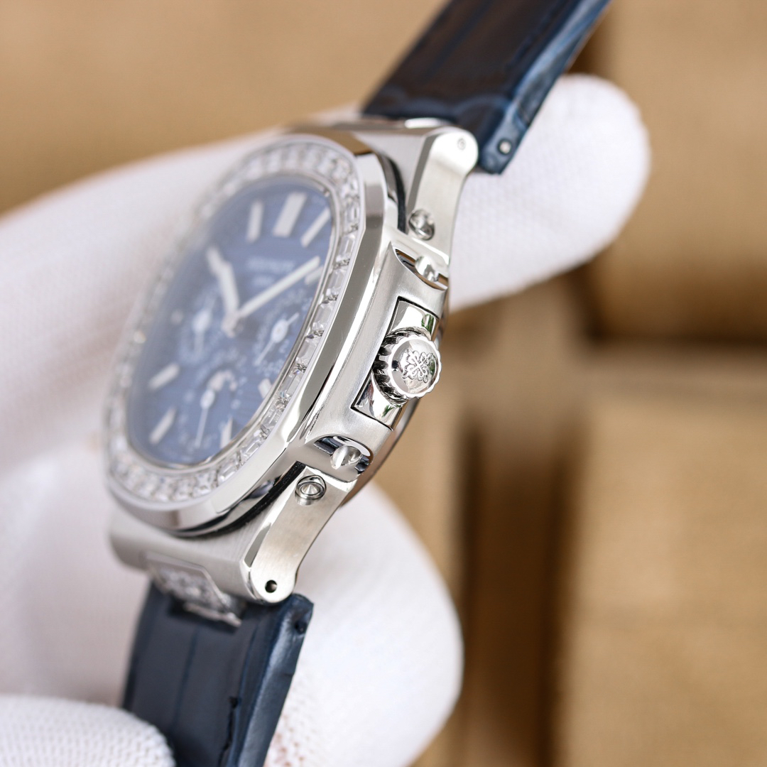 Large size, powerful performance: 40mm in size. Features include: year displayed in the left window, month displayed in the right window, day of the week at 9 o'clock, month at 3 o'clock, and 24-hour and moon phase display at 6 o'clock.
