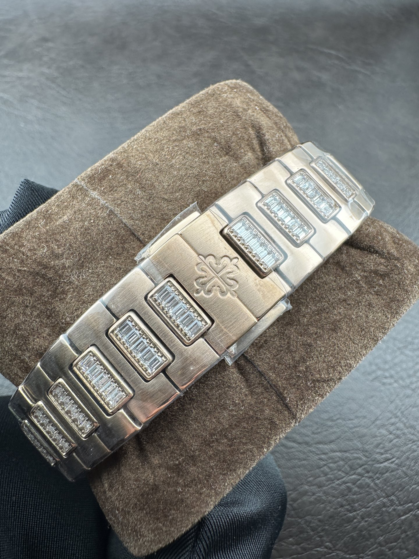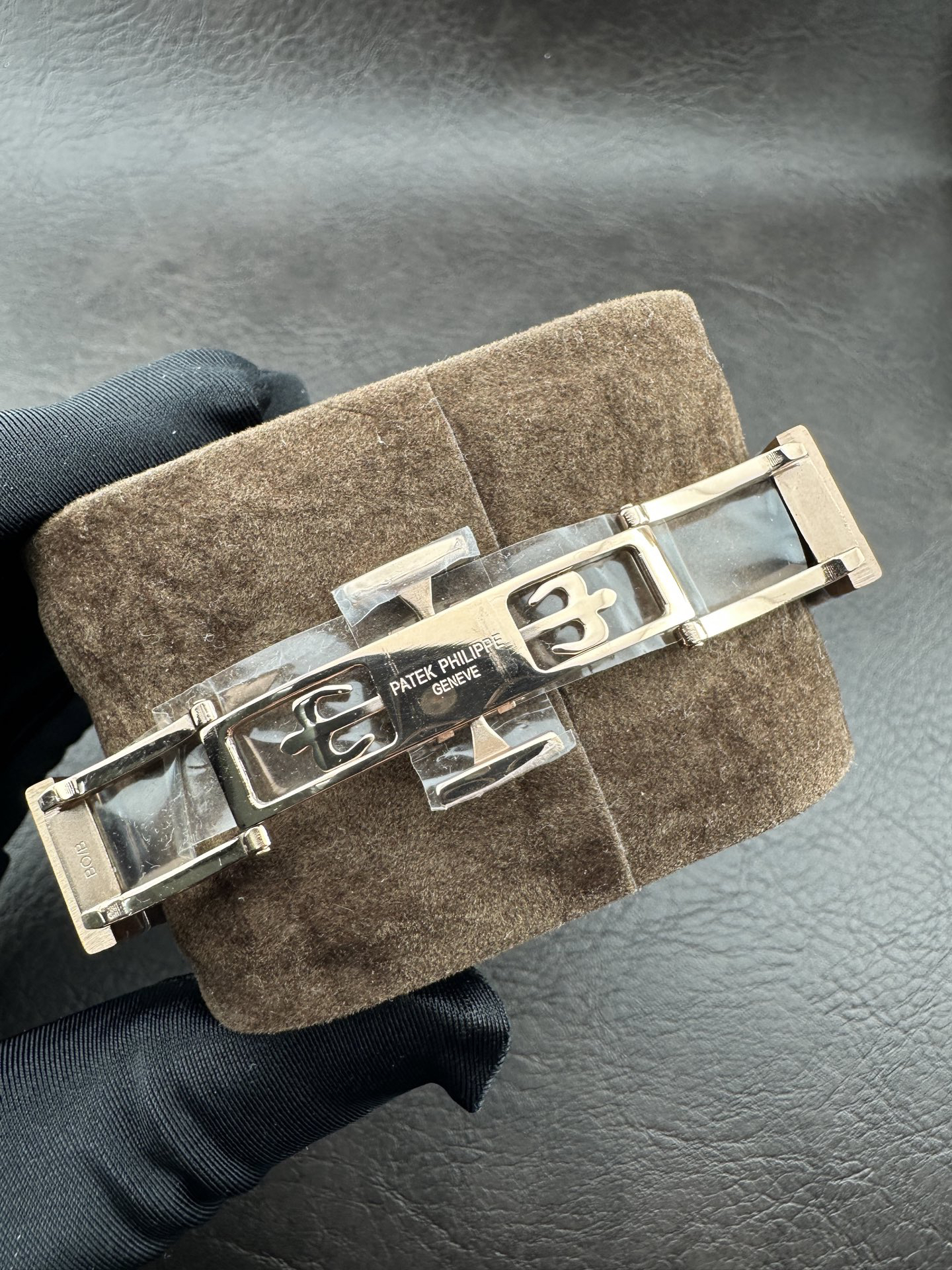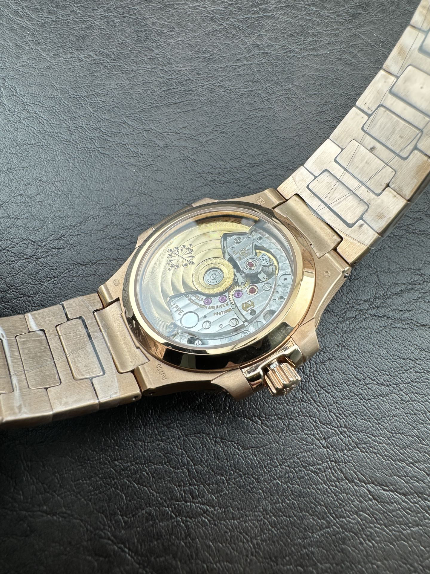 The bracelet features a logo-engraved openwork clasp that opens and closes smoothly and fits comfortably on the wrist; the sapphire crystal case back allows for a clear view of the intricate movement.