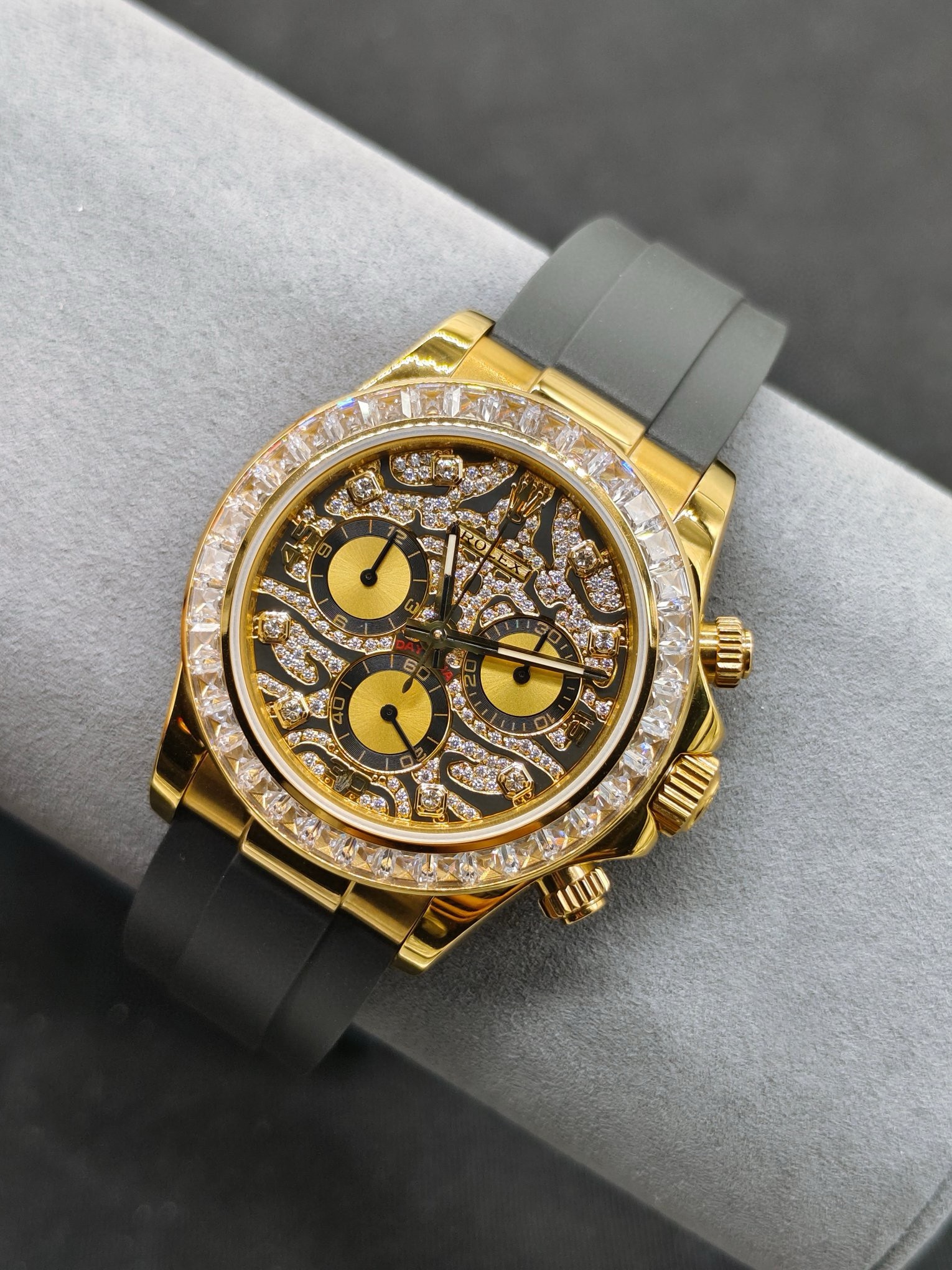 Case Diameter: 40mm; Movement: 7750; Functions: Chronograph, Antimagnetic. (White Gold Tiger Eye, Yellow Gold Tiger Eye, T-square diamond meteorite dial, T-square diamond bezel mother-of-pearl dial) Powered by: 7750 movement, Size: 40mm. The little-known Tiger Daytona with a full gold dial, tiger stripe dial, later modified with full diamonds, the outer bezel set with 36 T-square diamonds, the dial and hour markers are made with the same high-quality diamonds. The tiger stripe Daytona, like the stripes on a tiger, the black and gold combination highlights its masculine power.