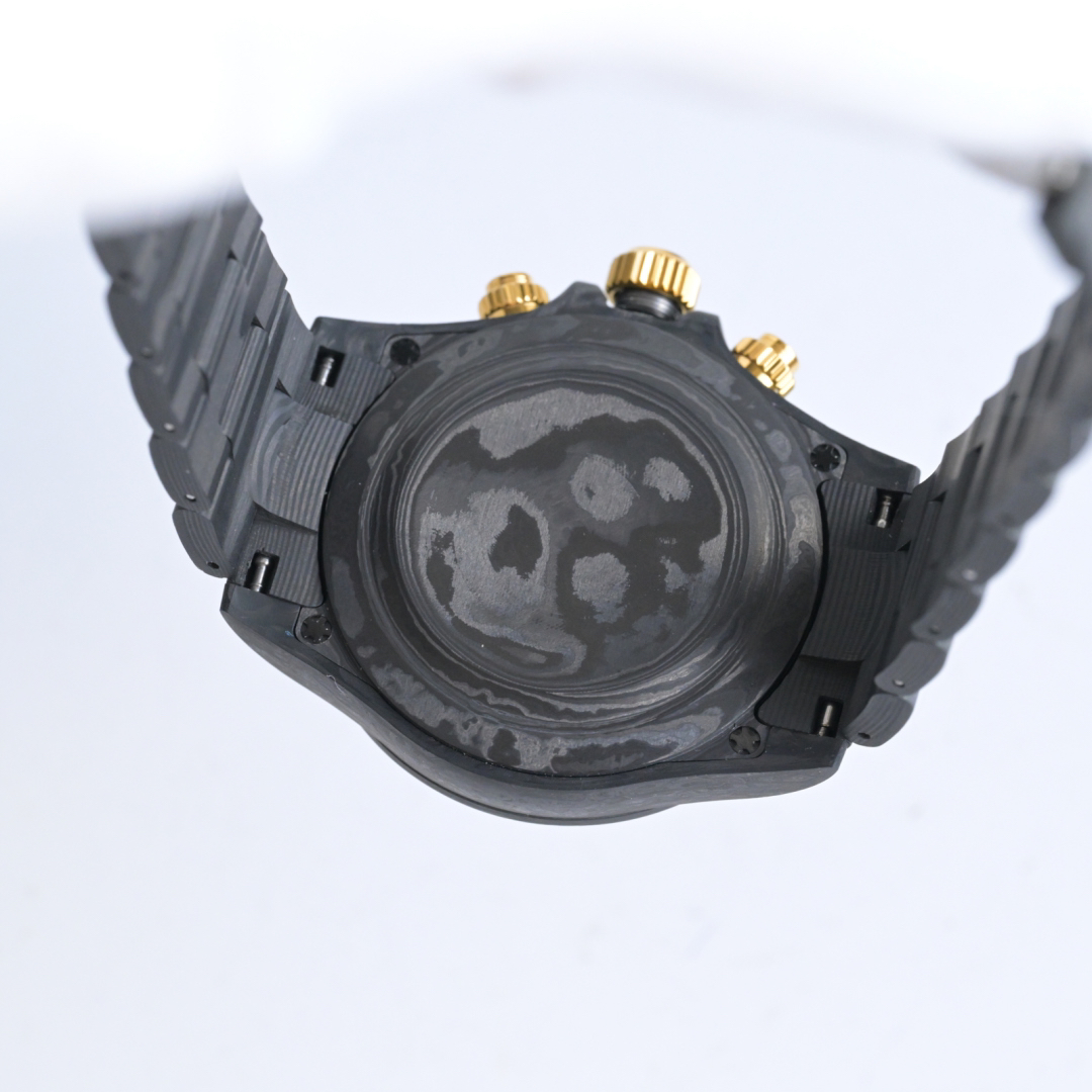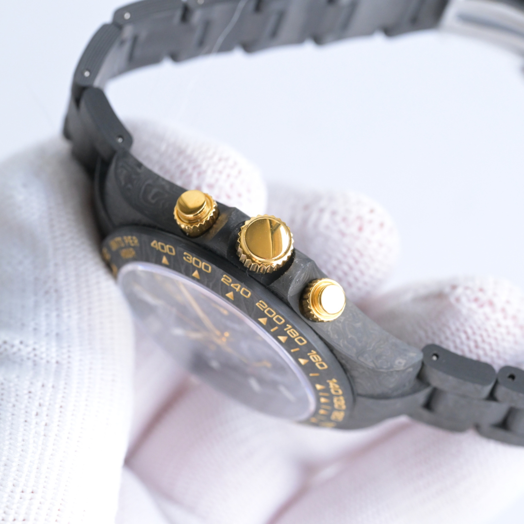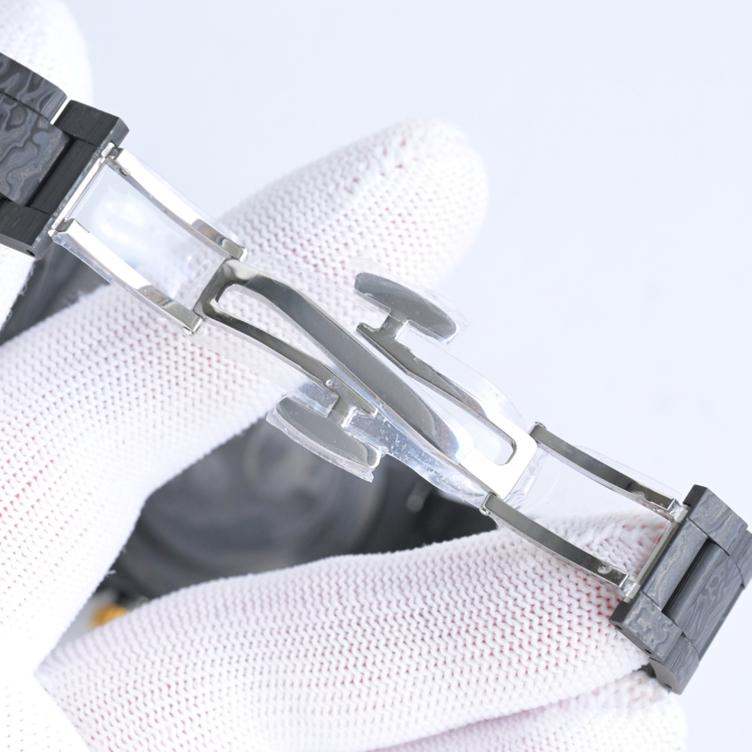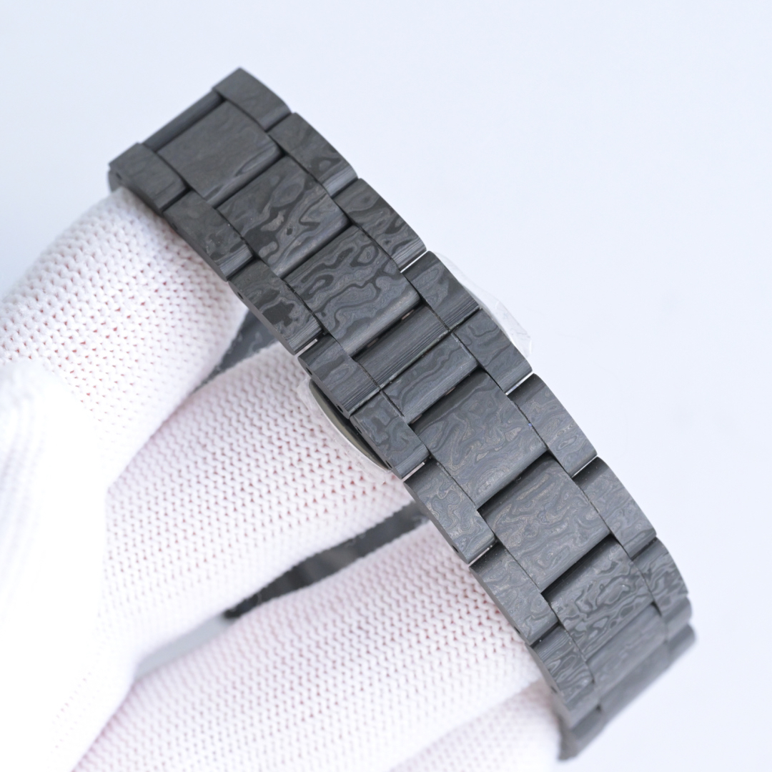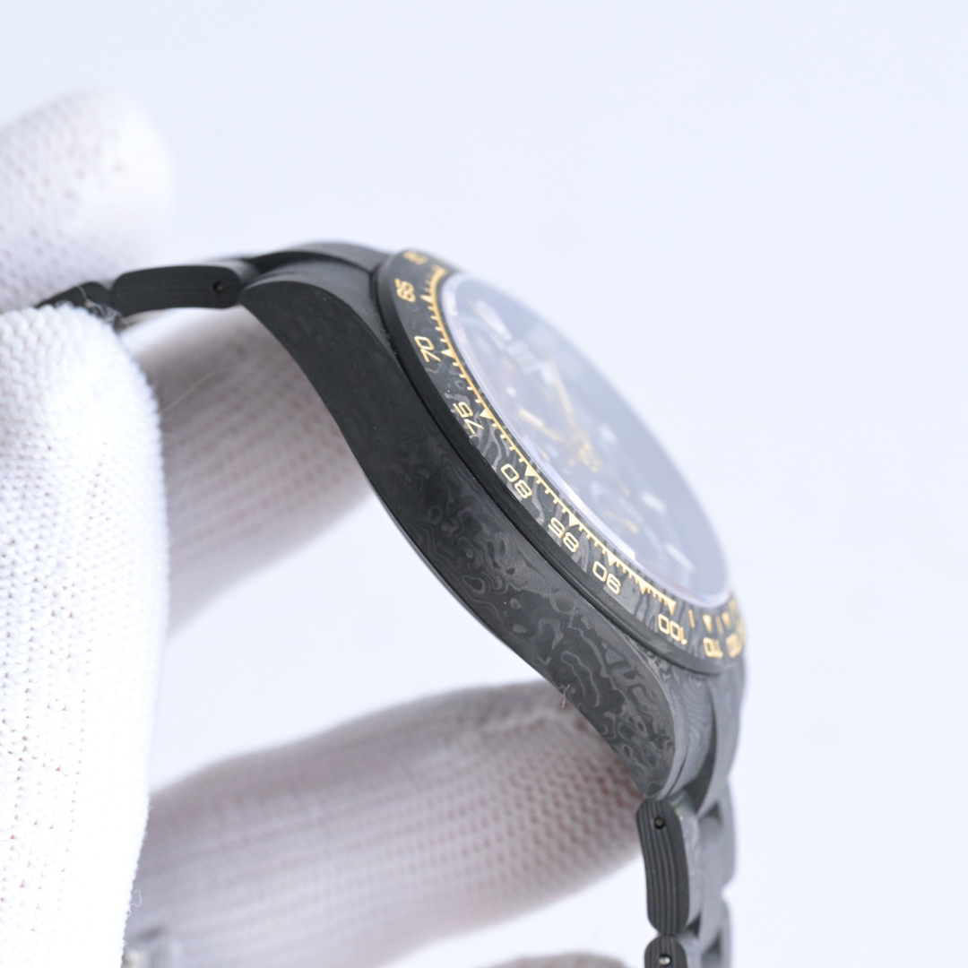 The entire case is made of imported composite carbon fiber, a new type of material with a timeless black color and an elegant, luxurious texture. Carbon fiber is flexible on the outside but strong on the inside, lighter than aluminum yet stronger than steel, and also corrosion-resistant. The case has a variety of textures, and each carbon fiber watch will display a unique pattern due to its different cutting methods, making it a one-of-a-kind piece. It is powered by the 4130 skeletonized movement, and the watch has a 40mm diameter.