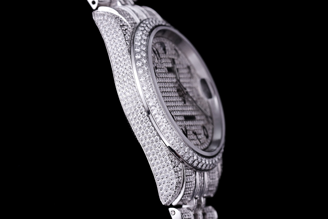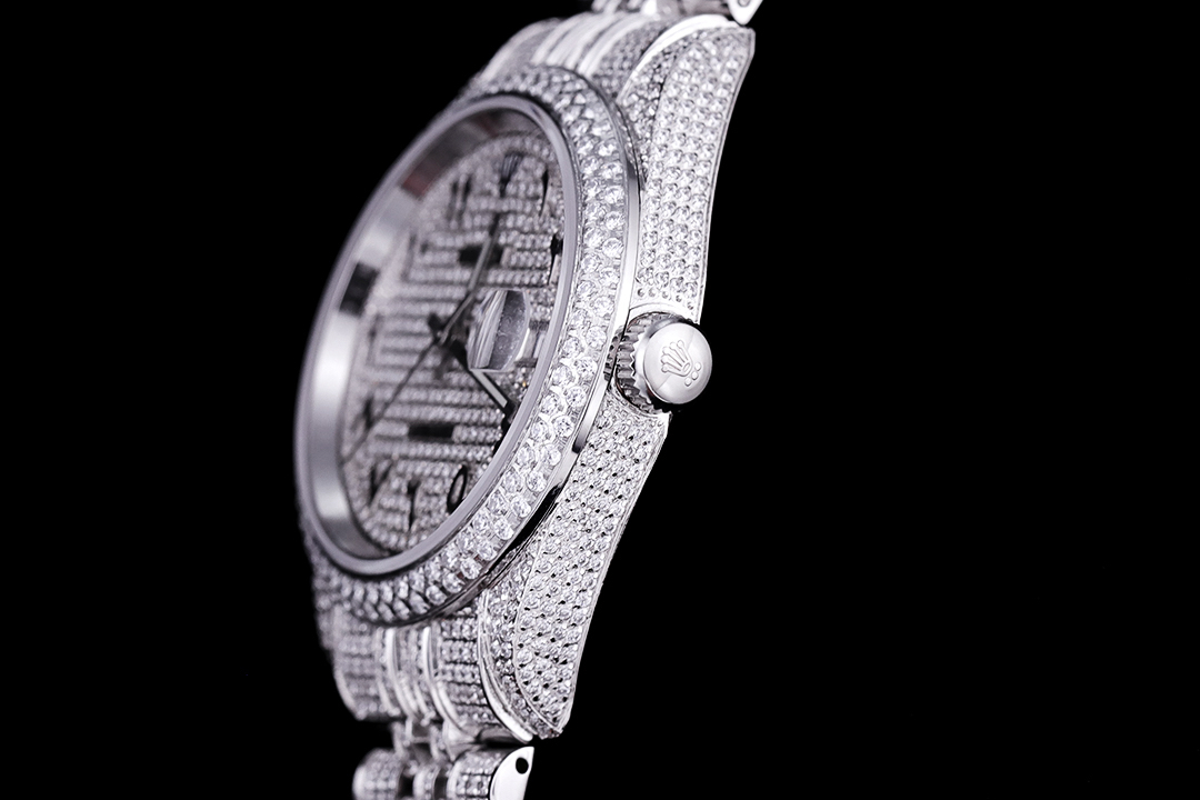 Crafted with over 2300 AAA cubic zirconia stones! Powered by a Swiss 2836 automatic mechanical movement! The entire case and bracelet are set with crystal diamonds, enhancing its brilliance under light! Comes with a 5-set full-diamond bracelet! 41mm diameter, sapphire crystal glass.
