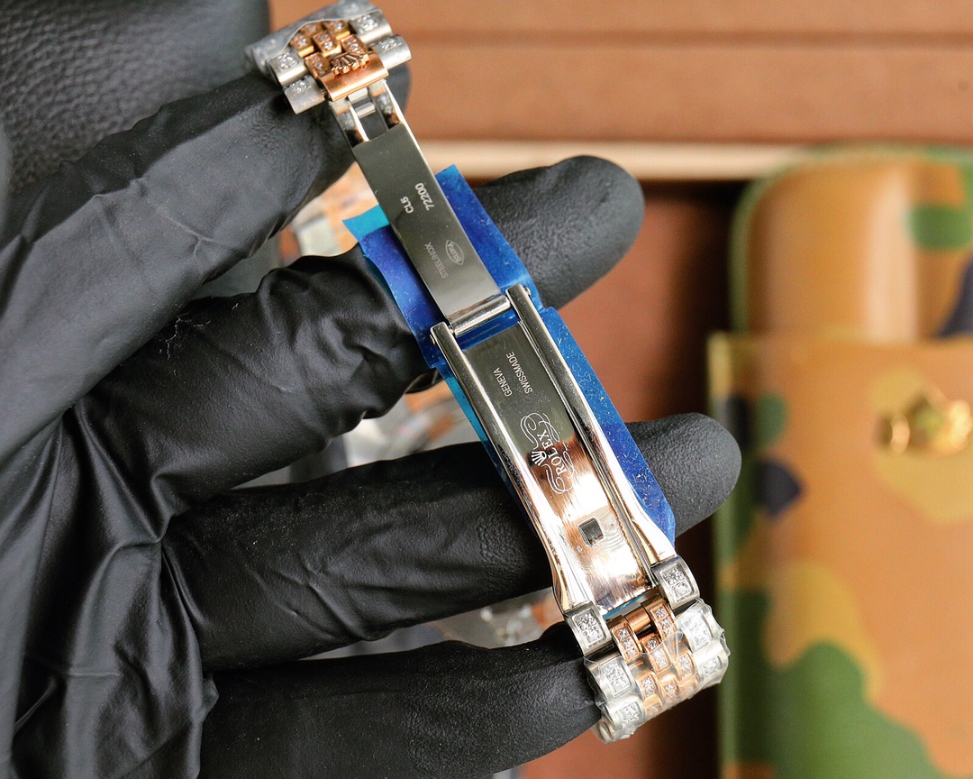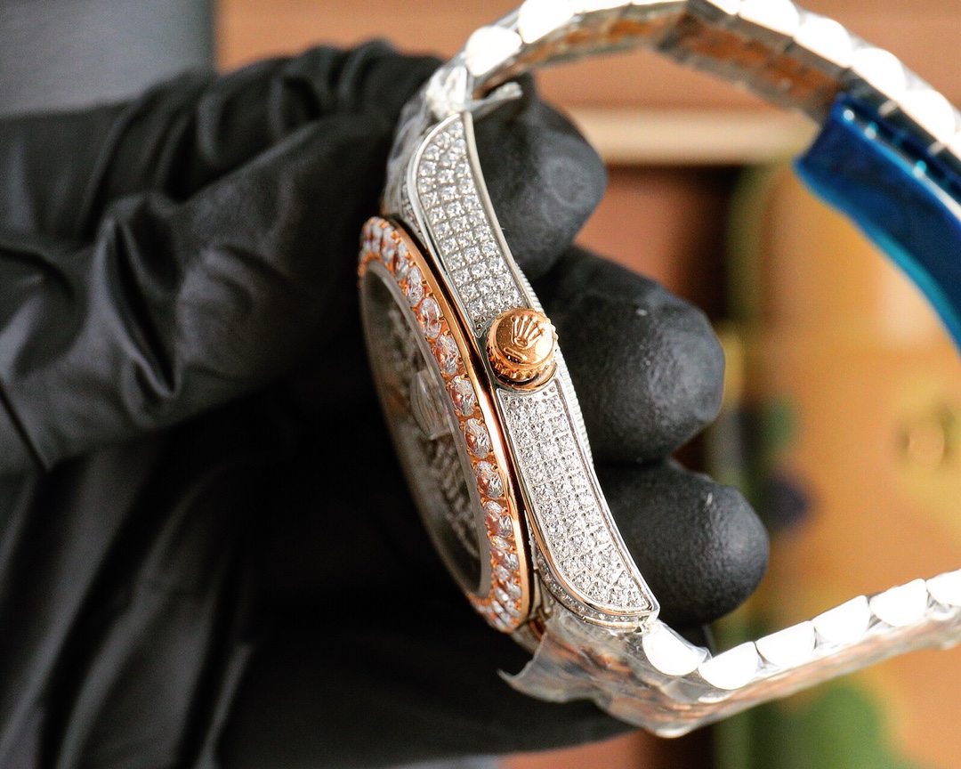 Based on Rolex's classic Submariner series, this timepiece features a modified bezel and is adorned with top-grade natural cubic zirconia, resulting in exceptional brilliance—a highly difficult and currently the most dazzling finish using this material. The movement is a fully automatic mechanical movement, and the dial boasts superior luminescence. The strap features custom-made curved links that perfectly fit the case. A 2cm adjustable clasp allows for easy size adjustment; the clasp measures 40mm.