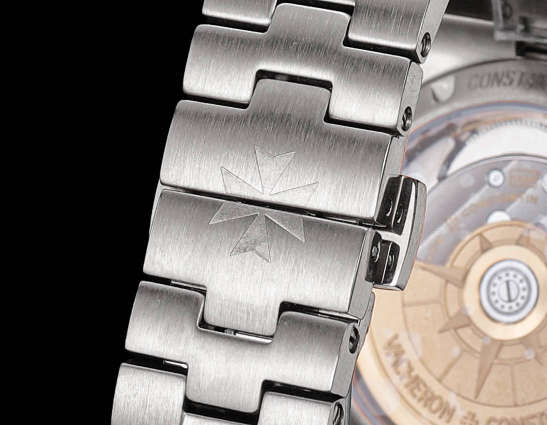 3. The watch features an integrated bracelet composed of thin Maltese cross-shaped links, conforming softly to the wrist like a second skin.