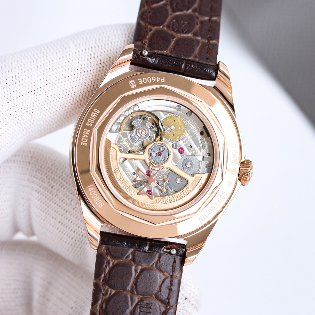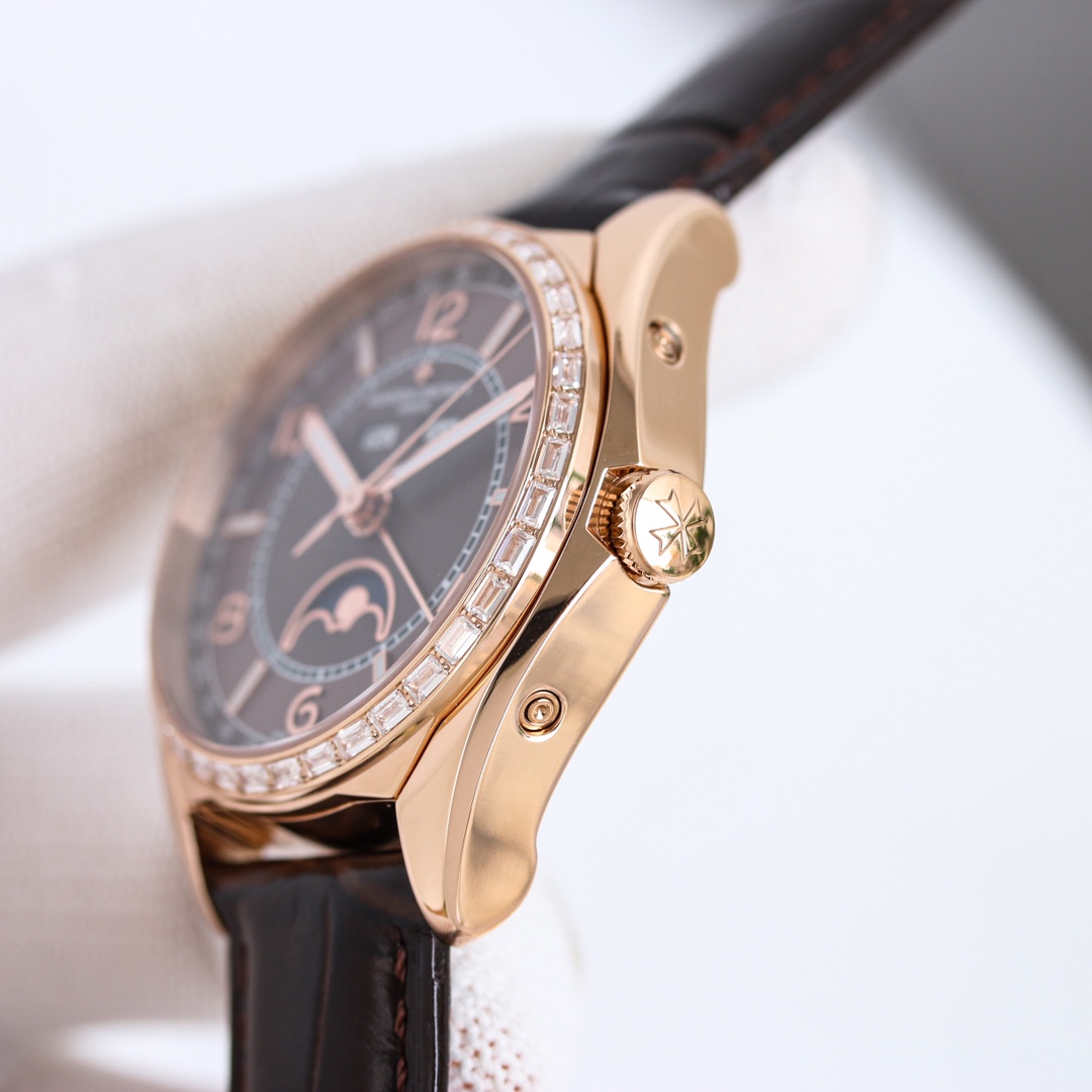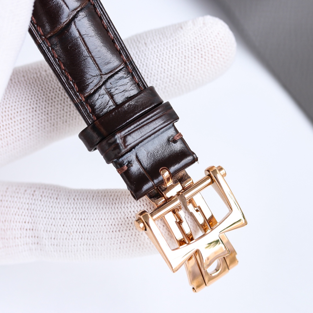 The checkered Italian calfskin strap and polished stainless steel folding clasp in a half-Maltese cross shape exude understated elegance.