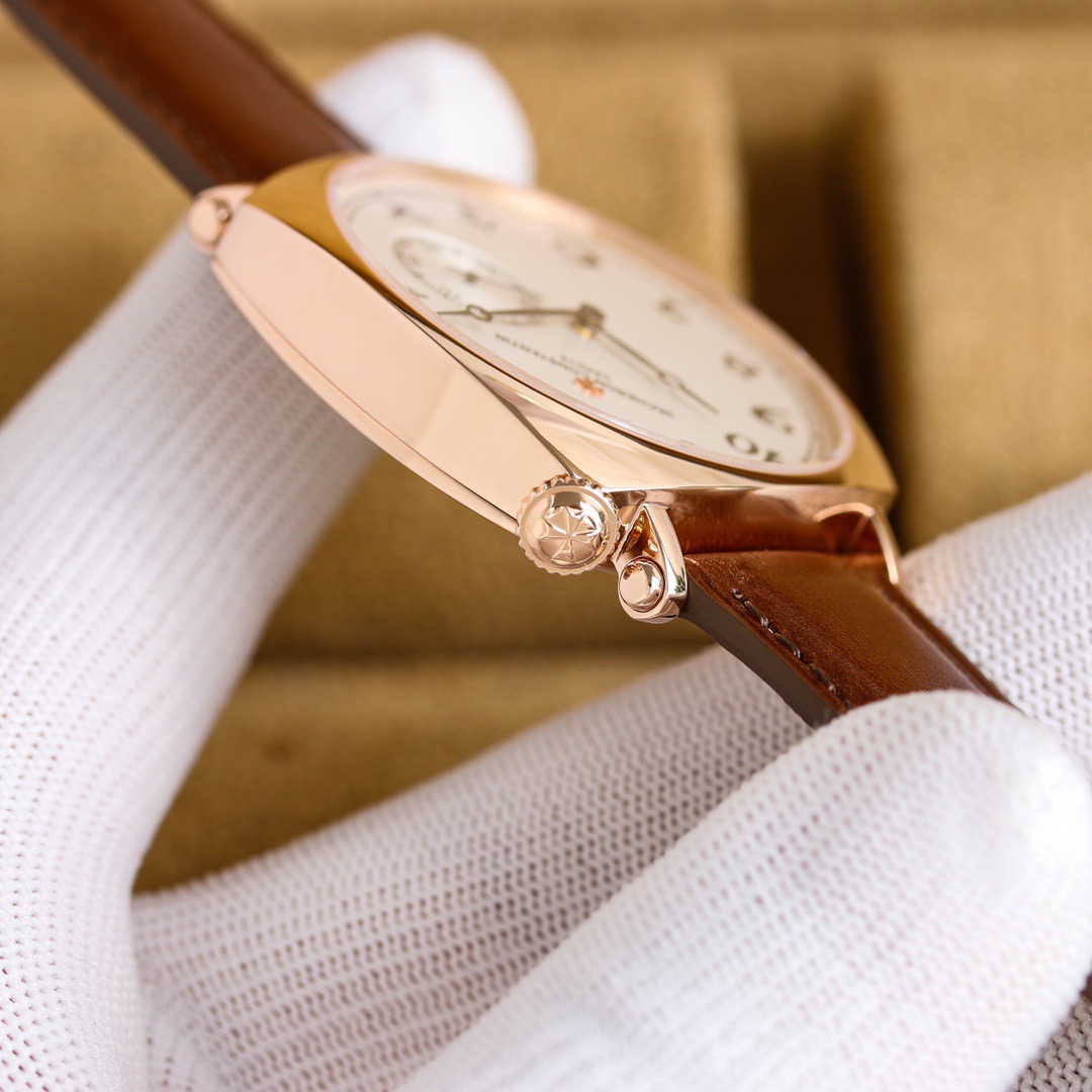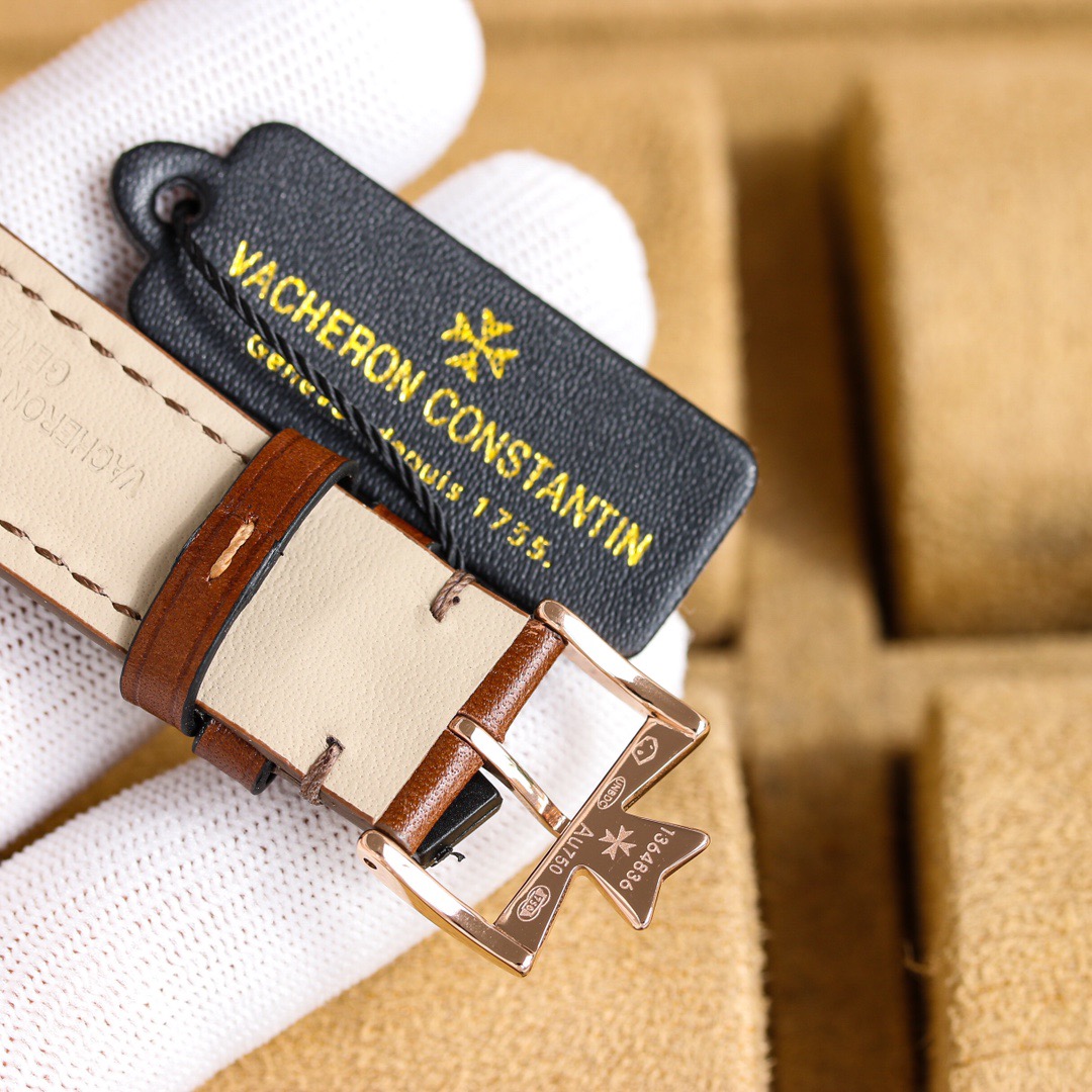 A uniquely commemorative cushion-shaped case, 40mm in diameter, based on the early cushion-shaped case design, blending modern high-quality materials, craftsmanship, and aesthetic concepts to reshape the classic; The crown is off-center, located in the upper right corner of the case for greater wearing comfort, and this design also originates from early cushion-shaped watches; The dial markers are arranged diagonally with reference to the case, making it highly distinctive; A polished pink gold Maltese cross is adorned at the 12 o'clock position, further highlighting the dial; Black anodized hour and minute hands, and a baton-shaped black anodized small seconds hand, elegant and chic.