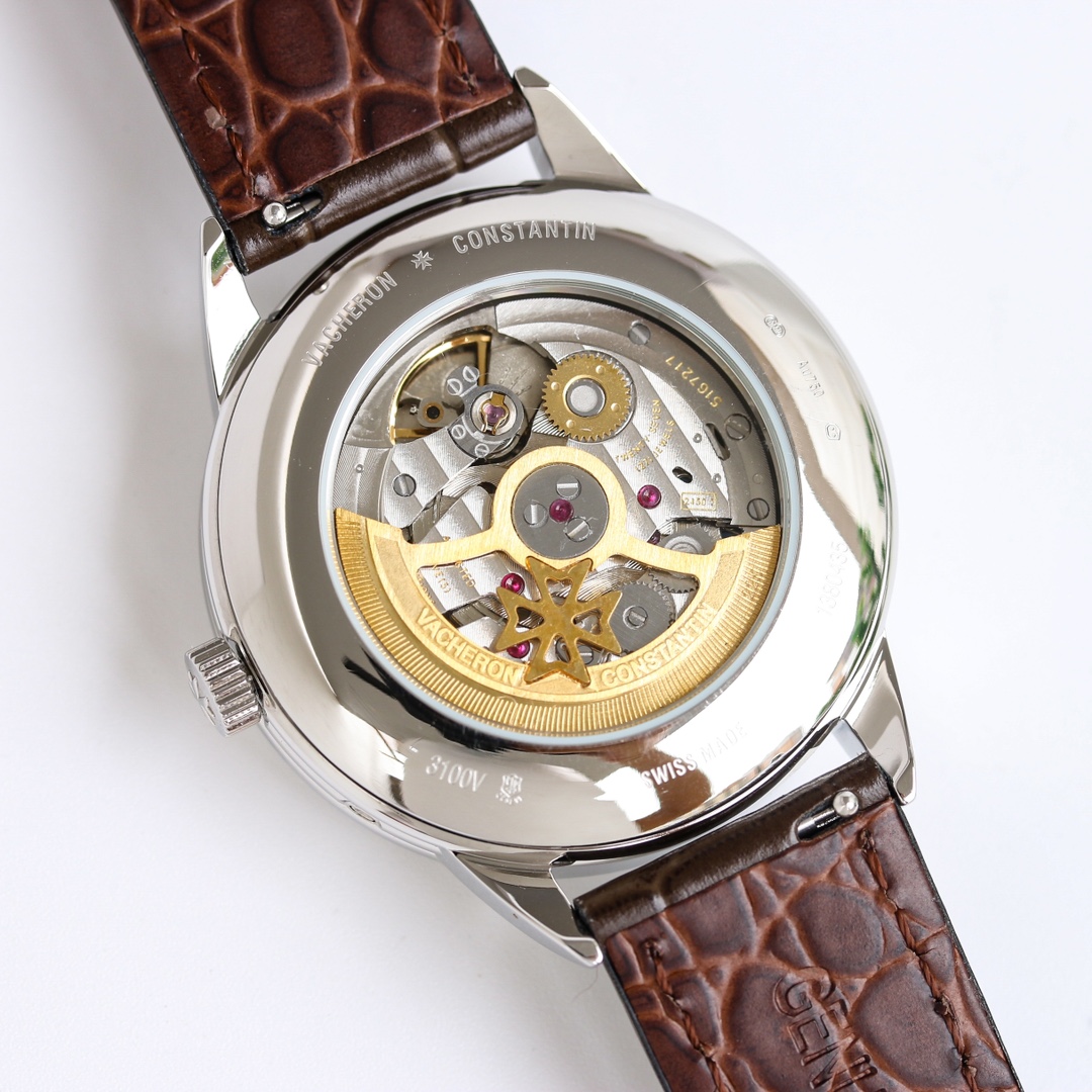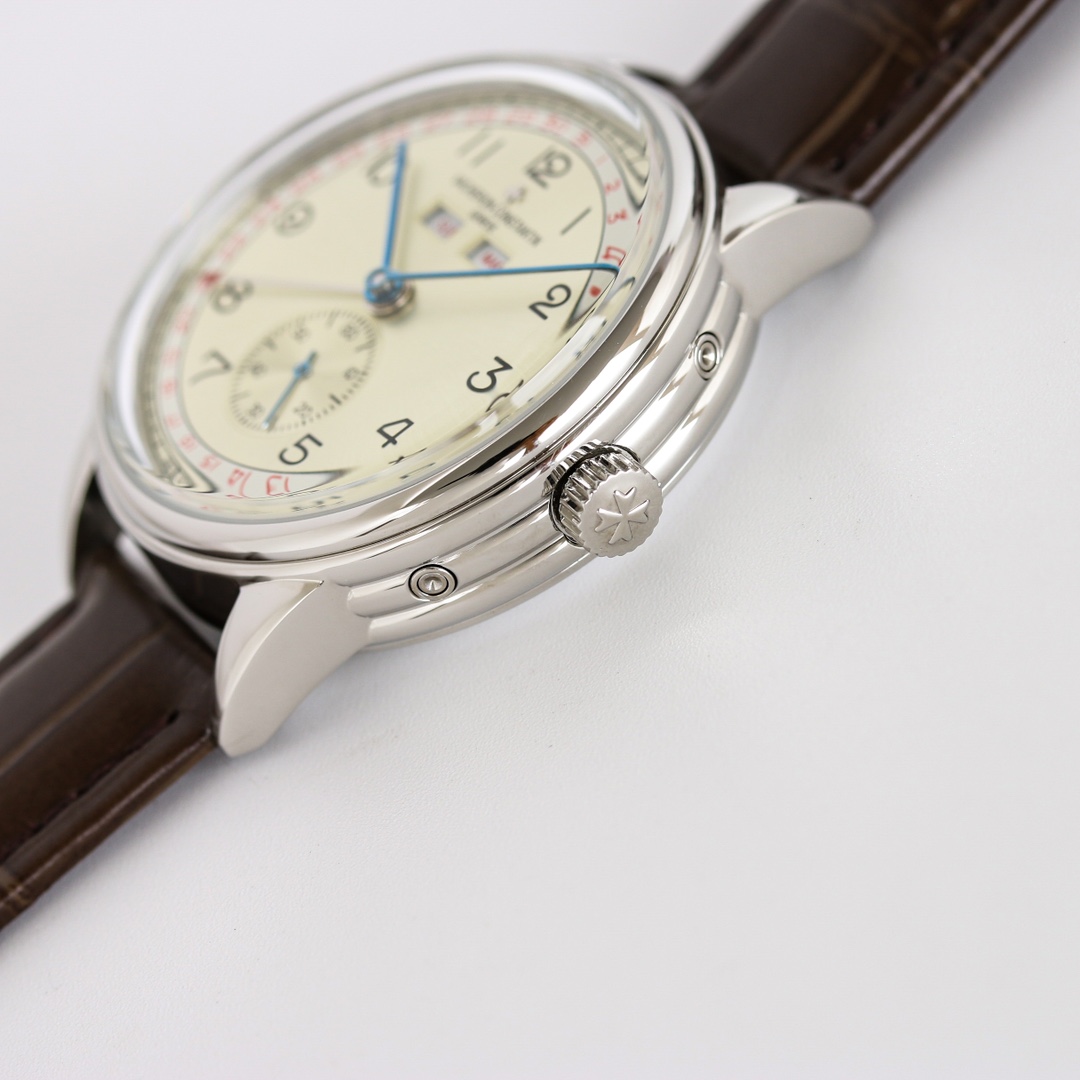 A triple calendar watch! Measuring 40mm, this case features a triple-embossed dial, exuding a vintage style, while the elegantly curved domed glass enhances the overall quality of the dial. The transparent case back allows a view of the exceptional movement finishing. It offers four main functions: month, day, date, and a 24-hour hand at 6 o'clock, all presented in a more refined and practical manner. The watch is paired with Italian calfskin for a comfortable and snug fit on the wrist, showcasing its luxurious character. Suitable for various business occasions, its understated elegance and sophistication are undeniable.