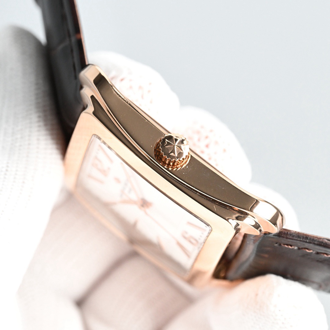 The glossy, square case, lined with a simple barleycorn dial, and paired with Italian calfskin leather, maximizes the artistic appeal of the timepiece.