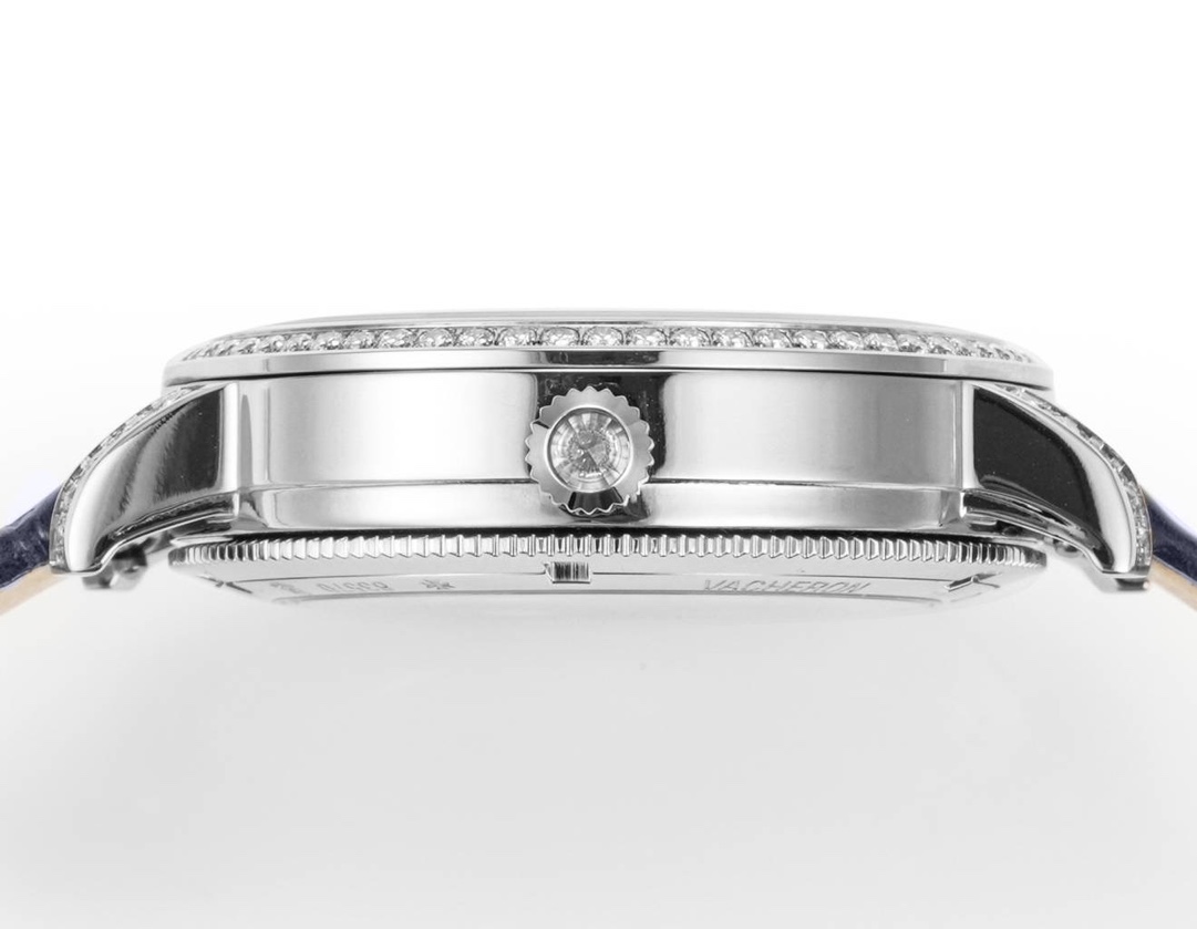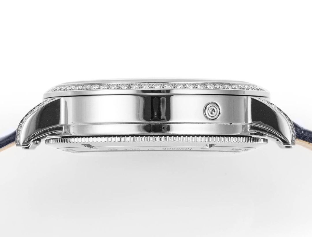 The Patrimony Moon Phase watch features a 36mm round white gold case, with the bezel, lugs, and crown set with 81 diamonds totaling approximately 1.2 carats. The white mother-of-pearl dial houses one of the most poetic complications of high-end watchmaking: the moon phase display.