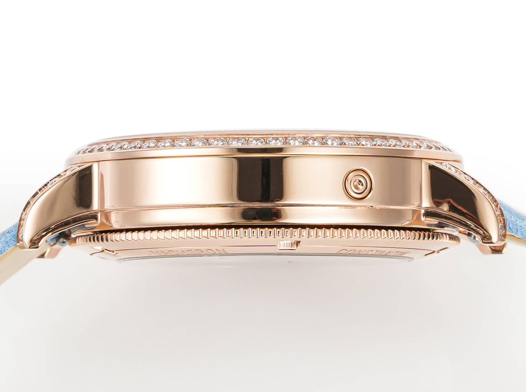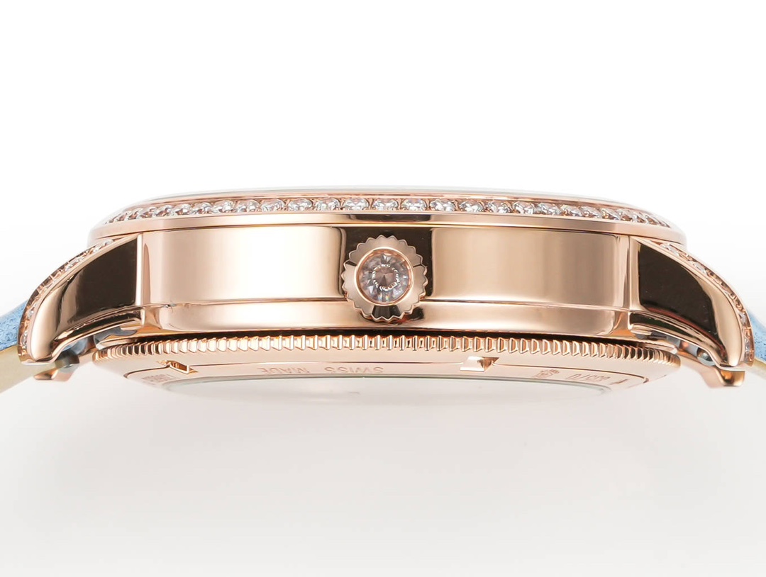 The watch is also paired with an understatedly elegant Italian calfskin leather strap, its graceful and feminine design making it a perfect choice for everyday wear.