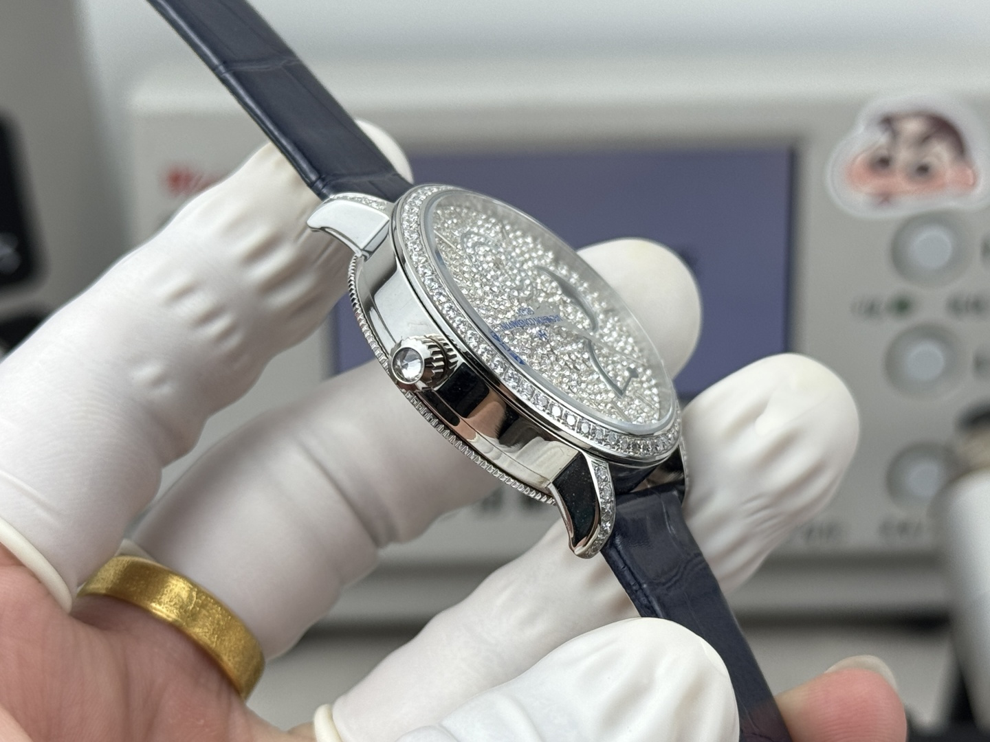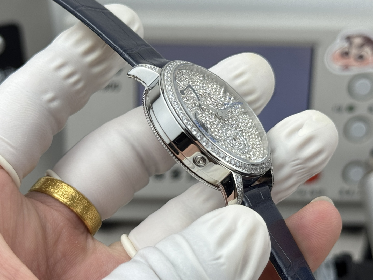 The 36mm diameter round white gold case features a bezel, lugs, and crown set with 81 diamonds totaling approximately 1.2 carats. The white mother-of-pearl dial is adorned with one of the most poetic complications of a high-end timepiece: a moon phase display. It boasts a power reserve of approximately 72 hours, providing ample power for the hours, minutes, small seconds, and moon phase displays.