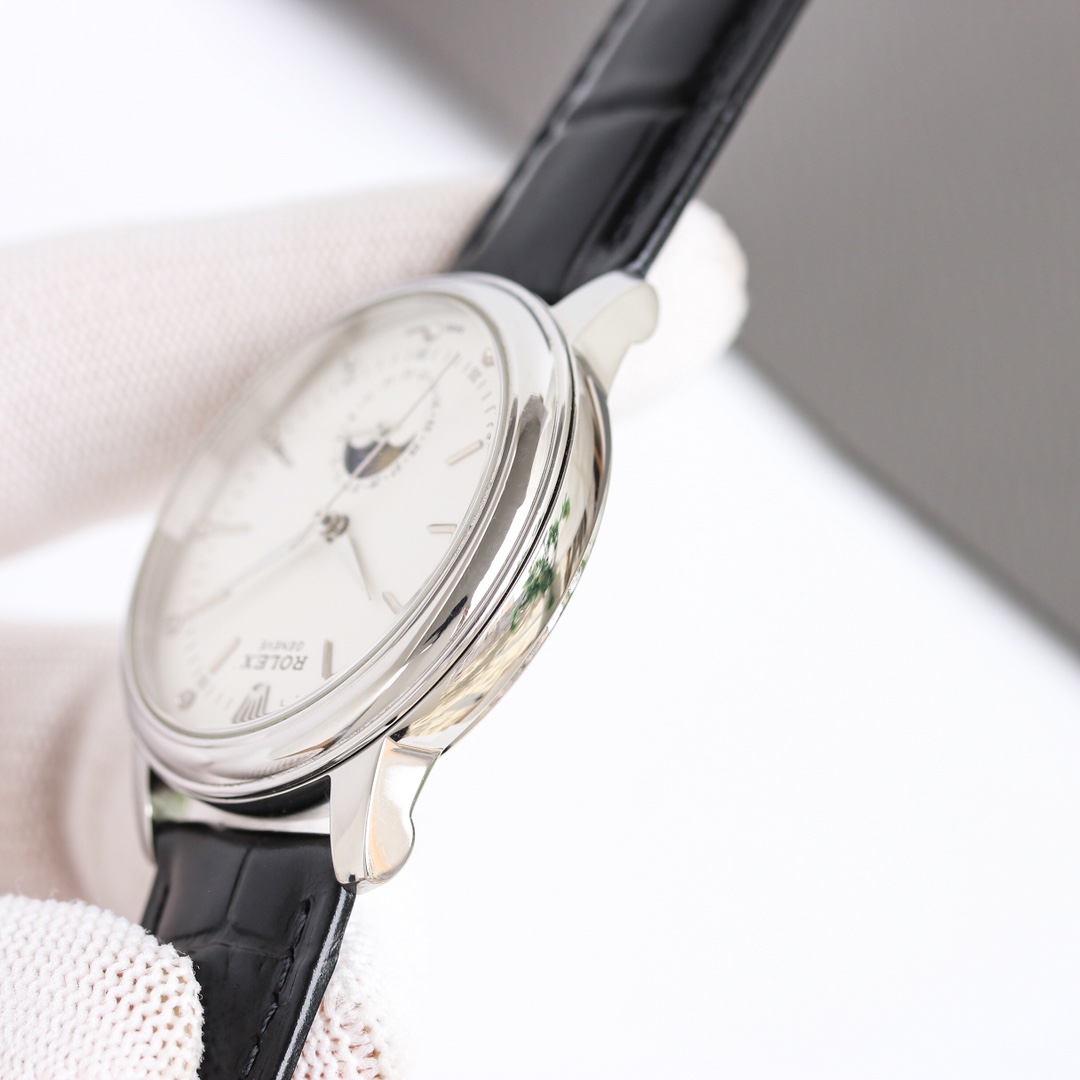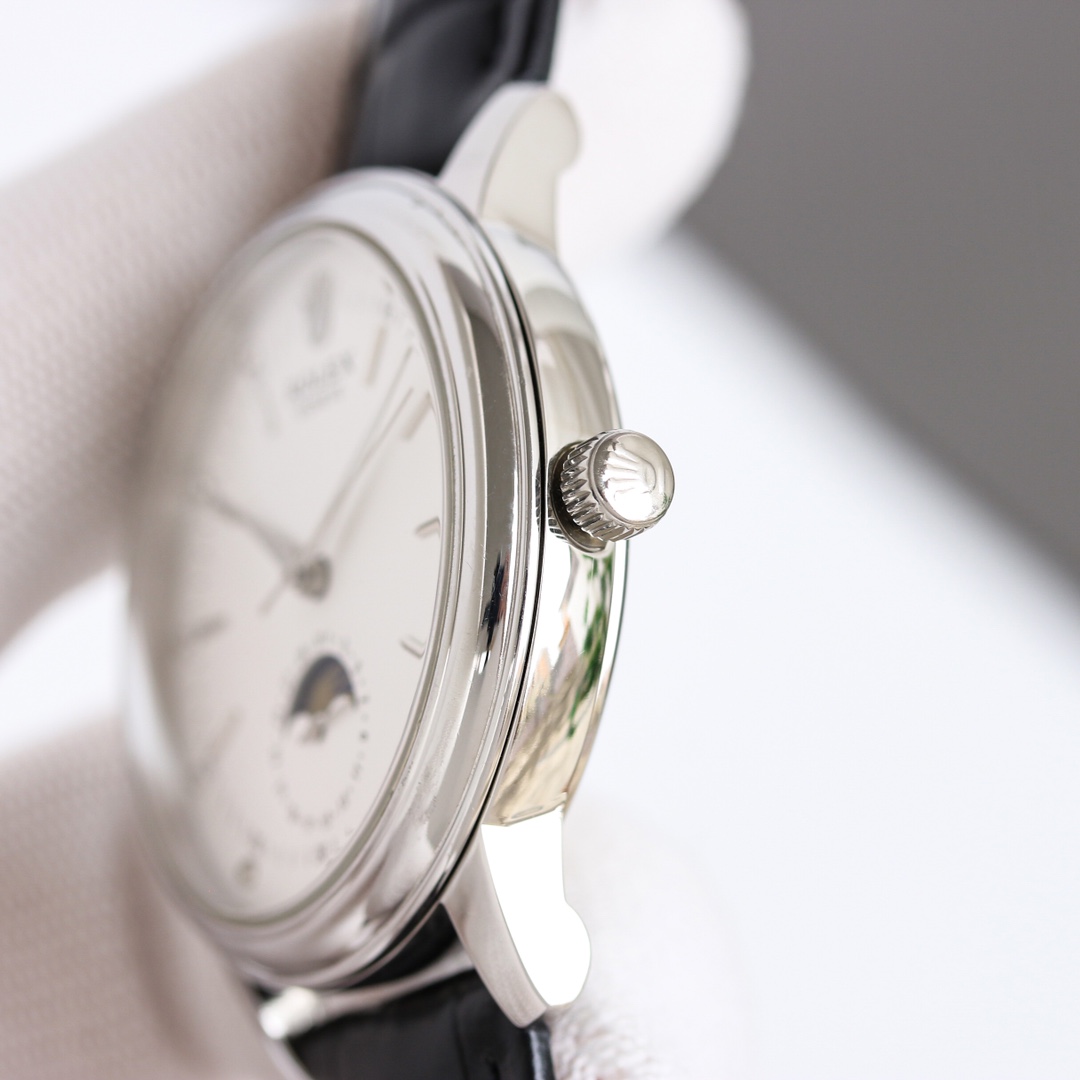 Powered by a Swiss ETA 2824-2 movement (true date at 6 o'clock and 24-hour moon phase function), this 40mm case features a 316L stainless steel case, scratch-resistant sapphire crystal, and excellent water resistance. It is paired with an Italian leather strap for a comfortable and snug fit on the wrist.