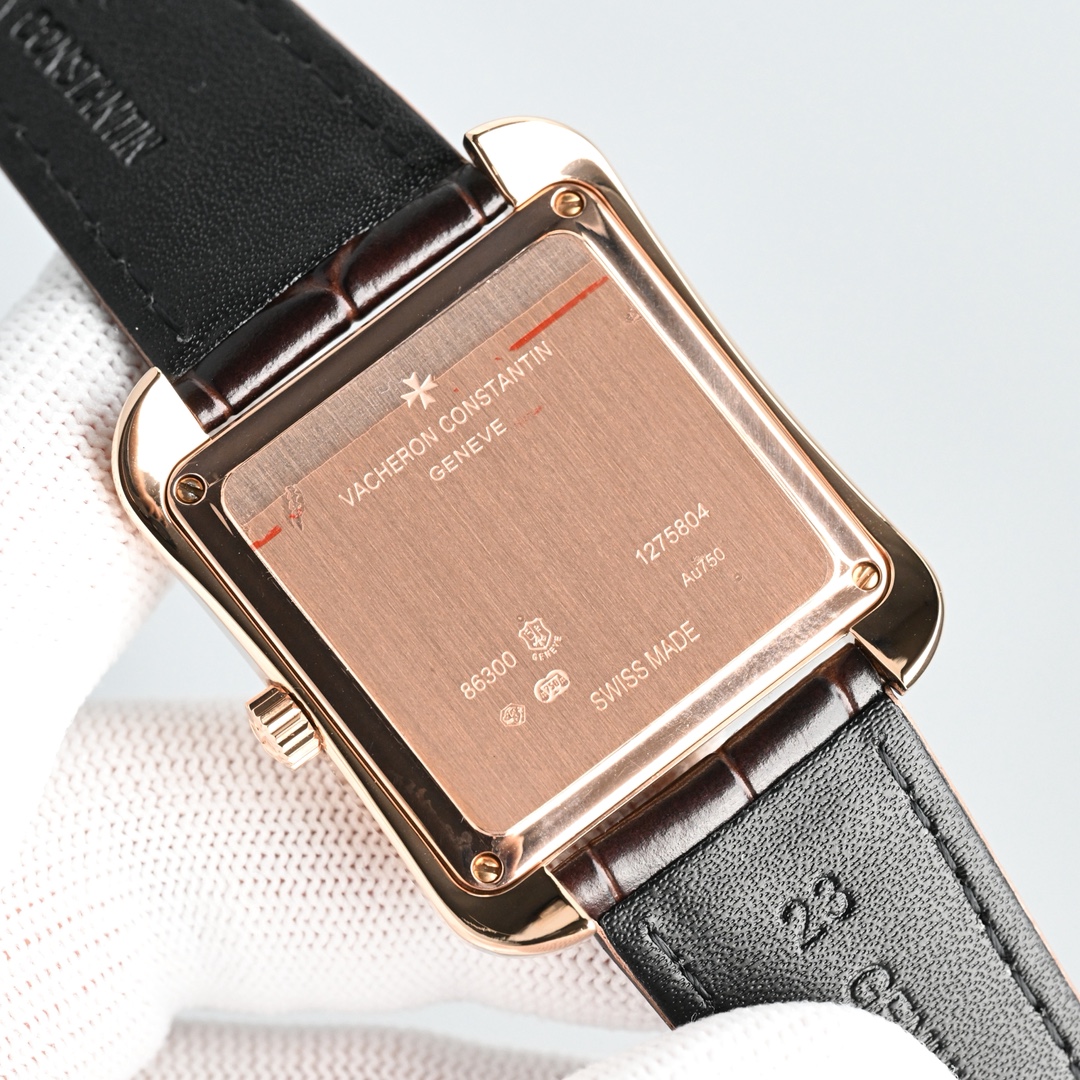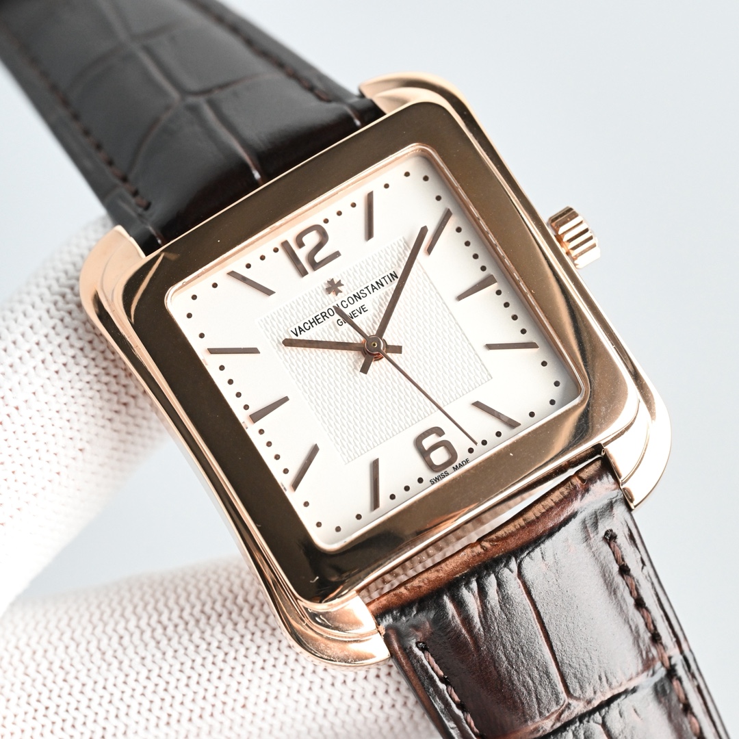 The watch features a glossy, square case lined with a simple barleycorn dial, paired with Italian calfskin leather, maximizing its artistic appeal.