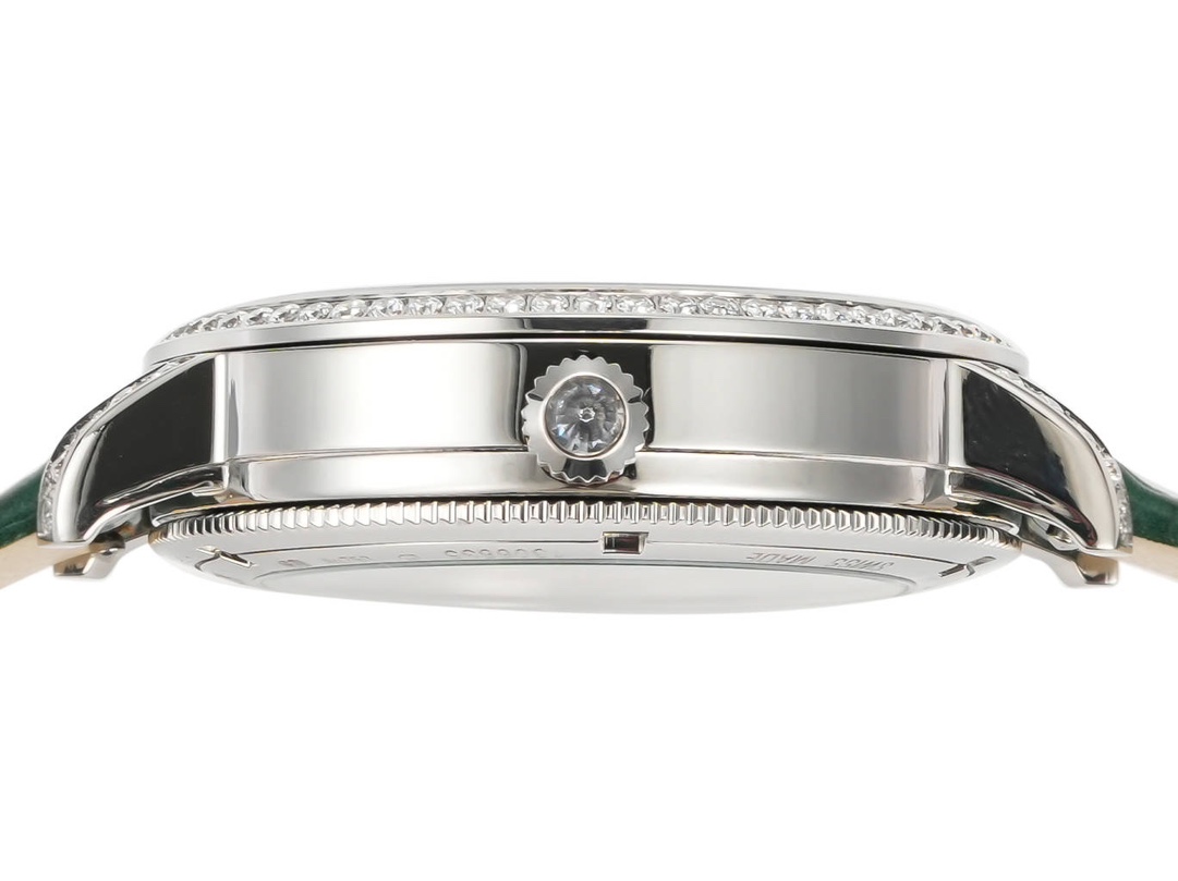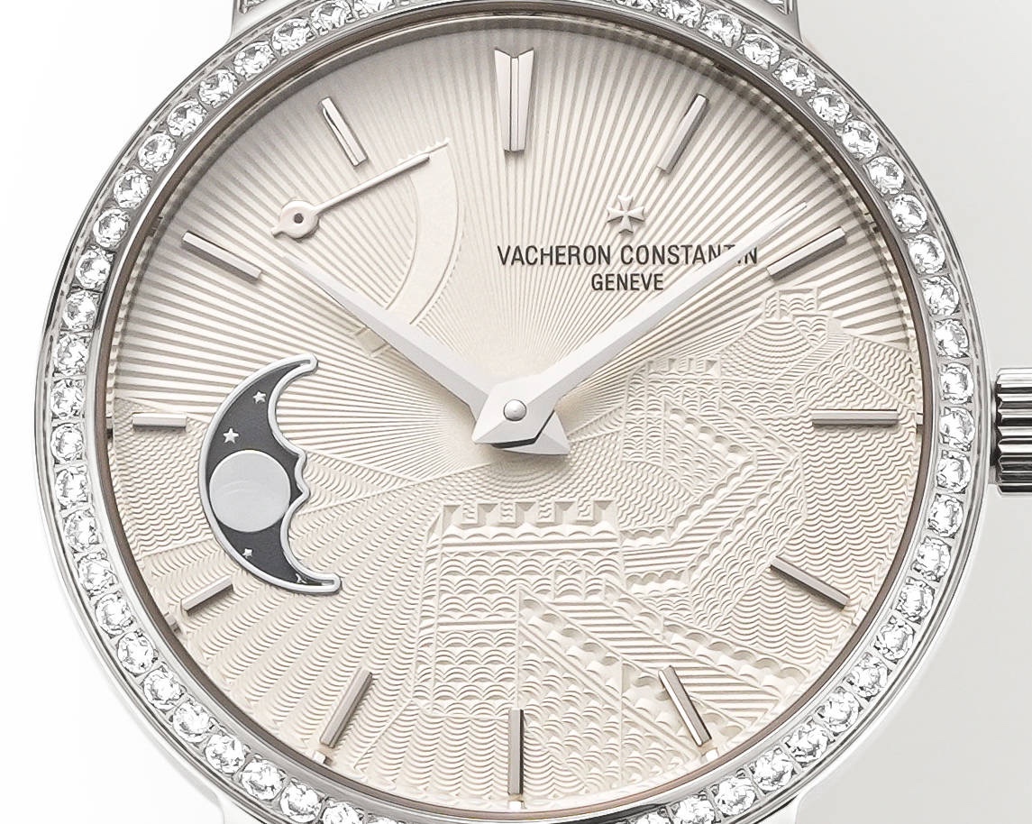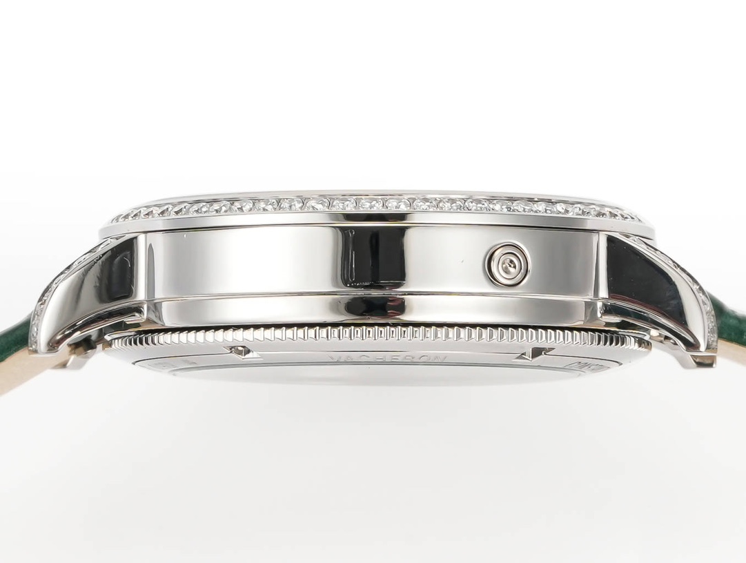 The 36mm diameter round white gold case is set with 81 diamonds totaling approximately 1.2 carats on the bezel, lugs, and crown. The white mother-of-pearl dial features one of the most poetic moon phase displays among all the complications of high-end watchmaking.